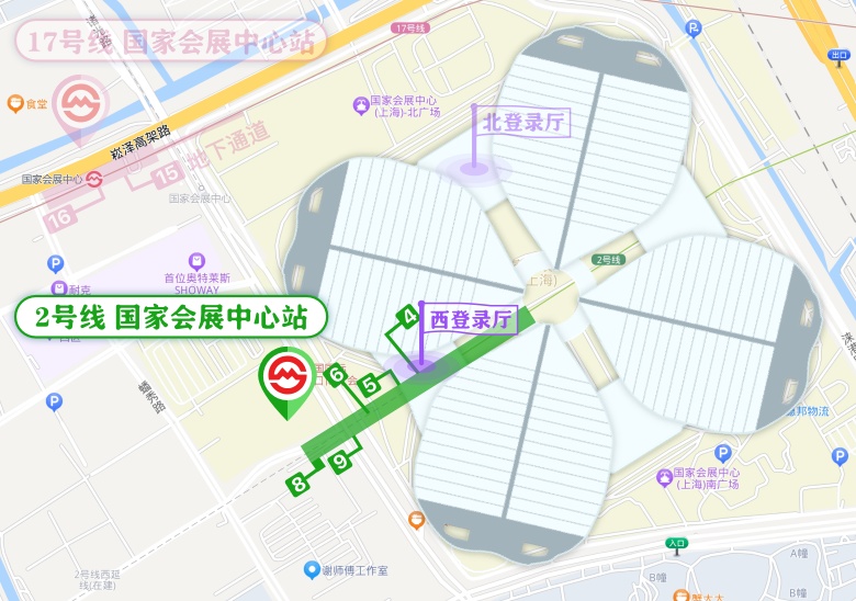 观众到达国家会展中心站后,从4、5、6、8号口出站至场馆西登录厅入场 (持进博会证件人员可从4、5号口出站)。