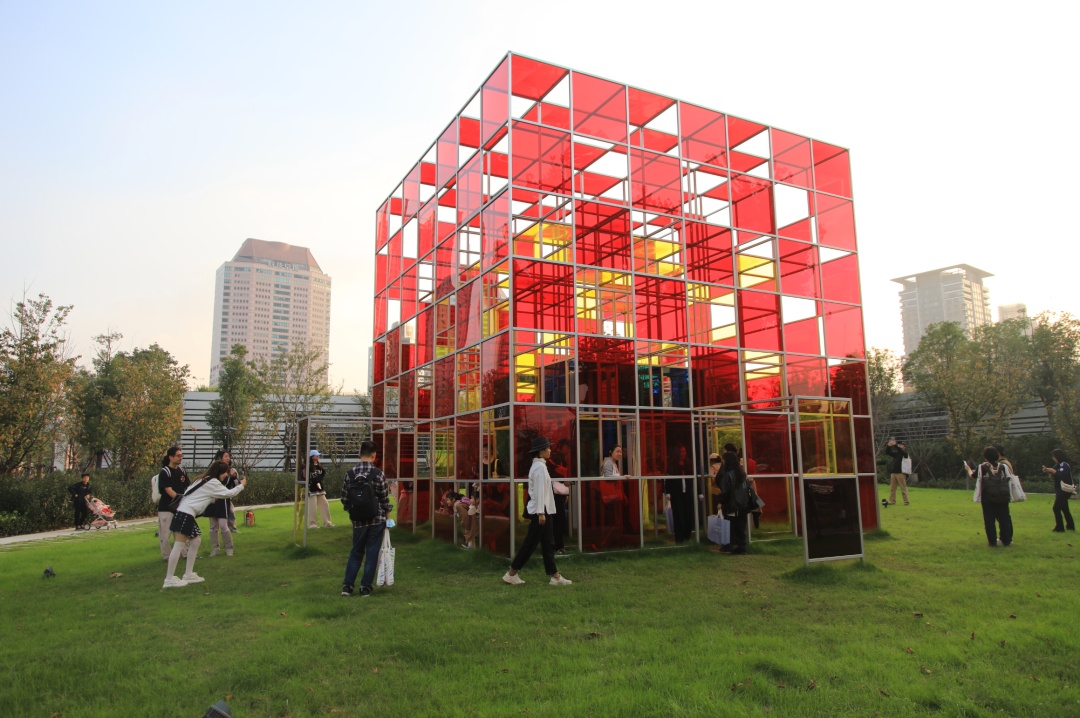 在位于苏河湾万象天地的作品《打开的小屋》边上,参与者走进作品内部,好奇地探索;
