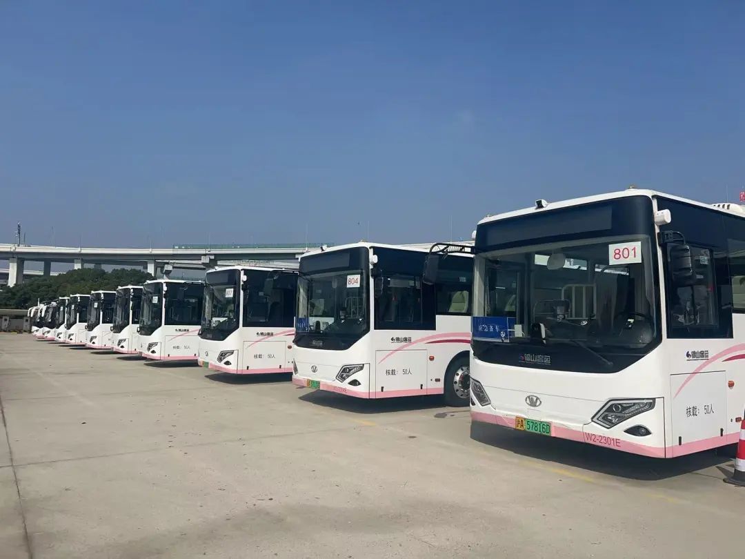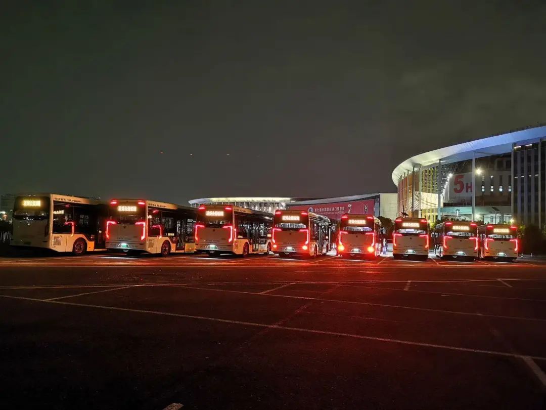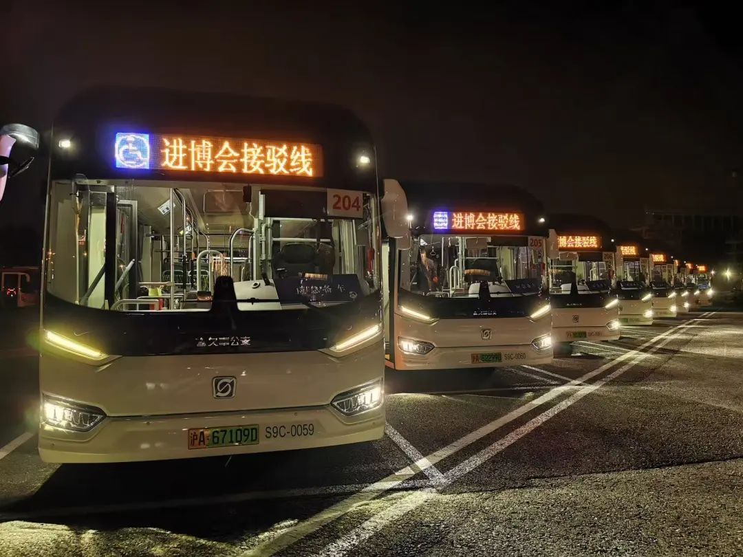 凌晨4:00,10辆进博保障公交车在进博会P1停车场一字排开待命,准备5点首班车发车。