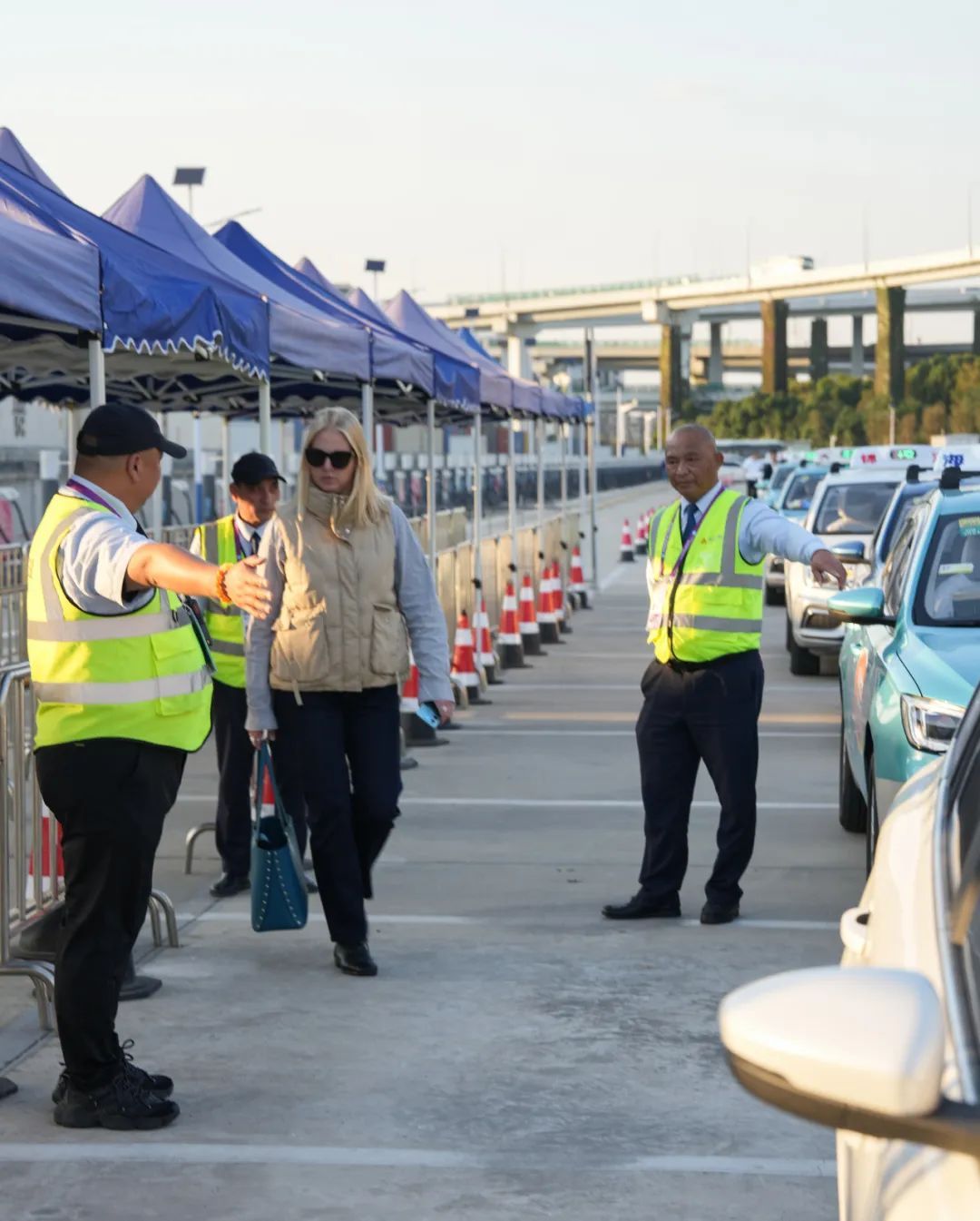 工作人员引导乘客有序乘坐出租车离场↓