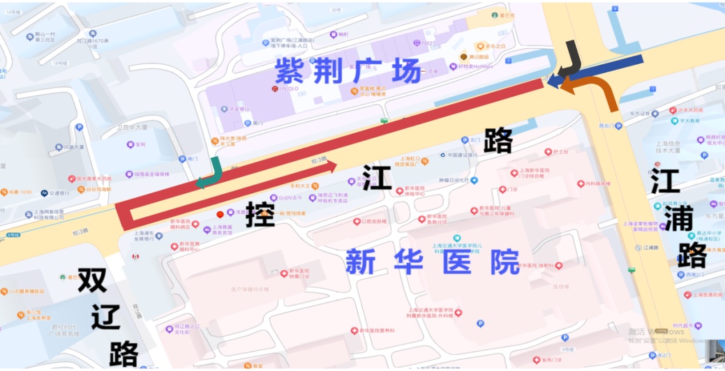 新华医院位于杨浦区控江路江浦路路口。由于医院门诊和急诊都位于控江路大门附近,因此进出控江路大门的车辆非常多。然而,控江路属于城市主干道,道路中间设置有隔离栏,东向西方向来车如果要进新华医院控江路大门的话,必须到控江路双辽路路口掉头。