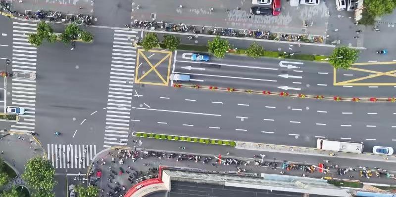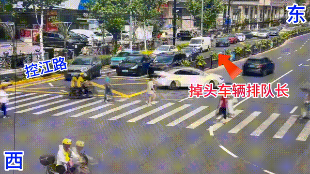 交警部门在路口东进口3号车道漆划掉头引导线,在南进口漆划右转引导线;同时,两处引导线交汇的东出口2、3号车道分隔线由虚线调整为实线,延伸至路内,长度20米,确保控江路东向东掉头车辆和双辽路右转车辆能各行其道,顺畅进入路段。