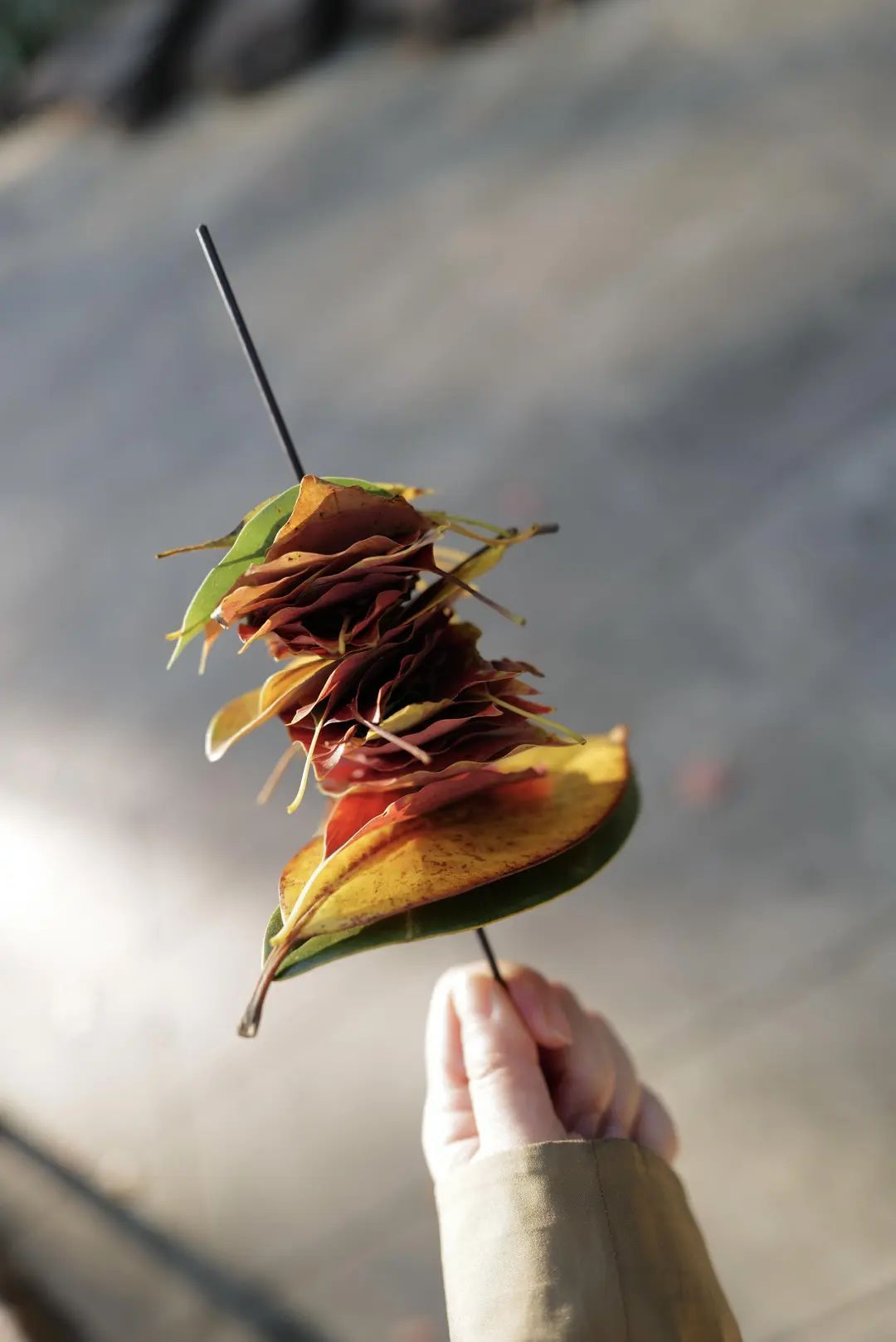 把地上的落叶一片片拾起来,串在棍子上,一盘“烤串”就这样完美出炉,来尝一口?
