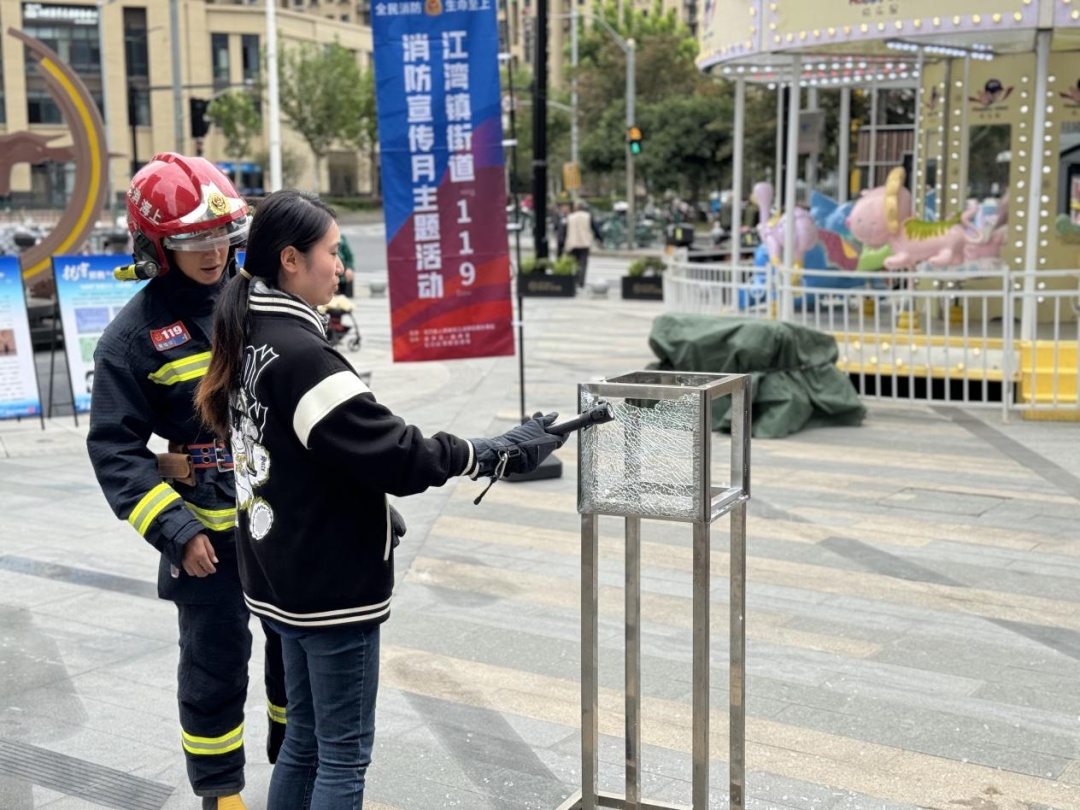 在消防体验区,消防中队的教官边示范边指导参加活动的居民群众亲身体验“灭火”和“破窗”,通过“零距离”接触消防安全,提升大家的安全技能。