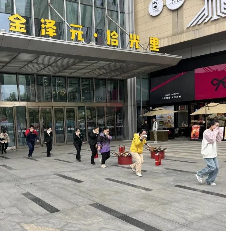活动现场,金泽元·拾光里项目部在消防中队教官的指导下,组织商场工作人员、平安志愿者、商户开展应急疏散演练,模拟商场发生火灾,商场消控室接报后立即启动应急预案,微型消防站人员携带灭火器开展初期火灾扑救,同时有序疏散顾客和商户,整个演练过程迅速有序,工作人员反应迅速、各司其职,演练有效检验了商场管理单位灭火应急救援力量应急处置和协同作战能力。
