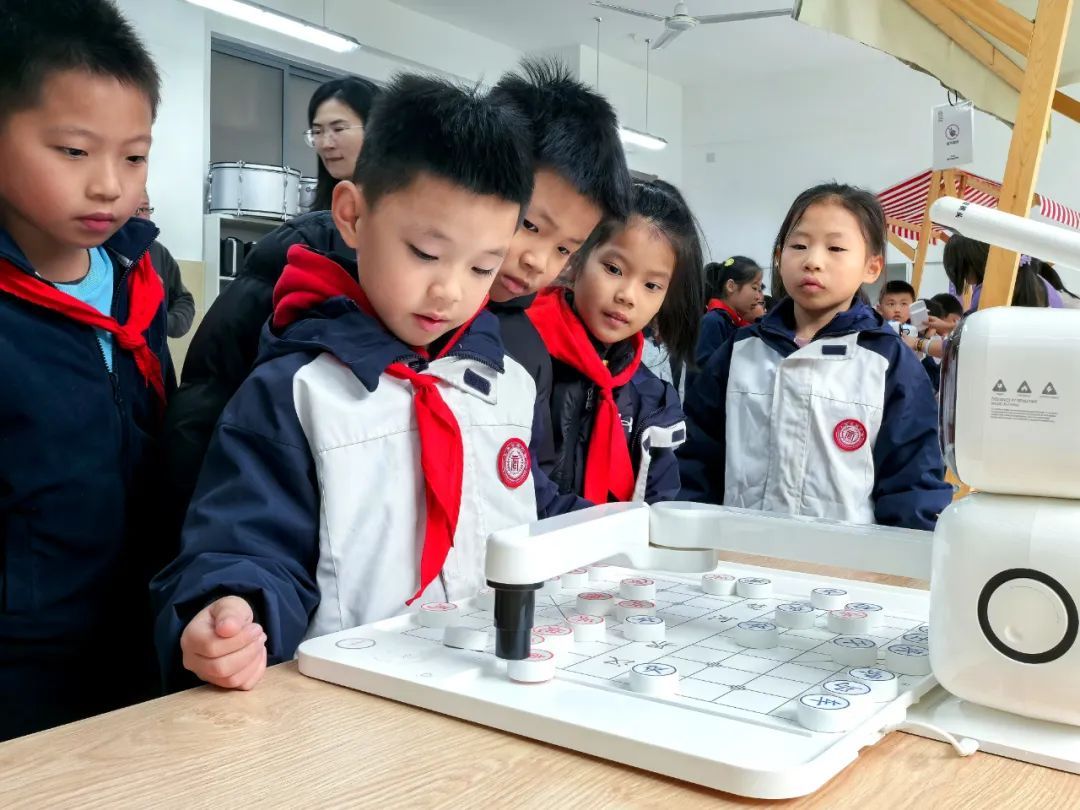 展示和互动区设在位于教学楼内部的校园云创长廊上。从廊道入口至出口处, AI作品展、AI创想阁、AI智趣坊、AI趣玩铺、AI创意铺、AI未来屋等依次分布。在AI趣玩铺,孩子们或站或蹲或坐,手持操作柄,指挥机器人滑行、做操、跳舞,玩得不亦乐乎。象棋棋盘前,方头方脑的机器人格外忙碌,等着与它对弈的学生排起了队。几轮对战下来,四(2)班学生蔡晟杰说:“跟机器人下棋就像是在和职业高手过招,它根本不会像爸爸妈妈那样让着我。”