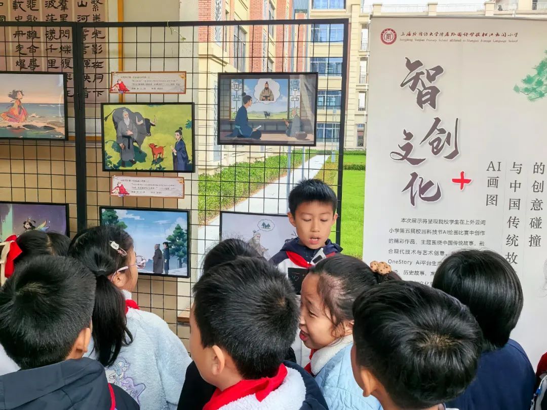 AI作品展上,一幅幅创意AI绘画引人驻足,创作者也现身说法,为师生们介绍各自的创意。上外云间小学三(3)班学生史若凡的作品名为《后羿射日》。初次尝试AI绘图,她就迷上了聪明机灵的AI绘图工具。“《后羿射日》故事里的太阳很多,需要多次生成,加上前期测试,我大概生成了20个太阳,最后才得到这样一张比较满意的图。” 史若凡说。