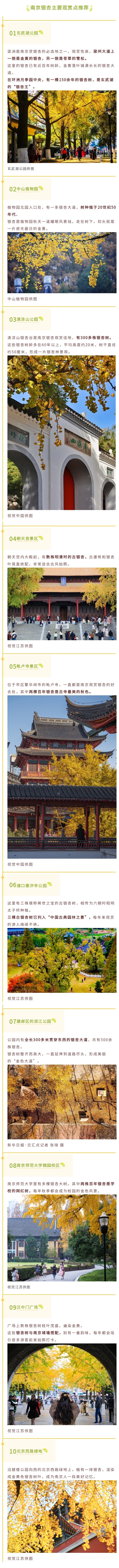 目前,南京园林绿地中广植银杏,市区公园景区和庭院内常常能看见很多百年大树。“最美银杏季”,南京这些最佳“赏金”点不容错过!