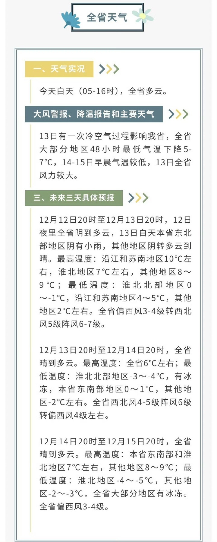 12月12日20时-12月13日20时,12日夜里全省阴到多云,13日白天本省东北部地区阴有小雨,其他地区阴转多云到晴。最高温度:沿江和苏南地区10℃左右,淮北地区7℃左右,其他地区8~9℃;最低温度:淮北北部地区0~-1℃,沿江和苏南地区4~5℃,其他地区2℃左右。全省偏西风3-4级转西北风5级阵风6-7级。