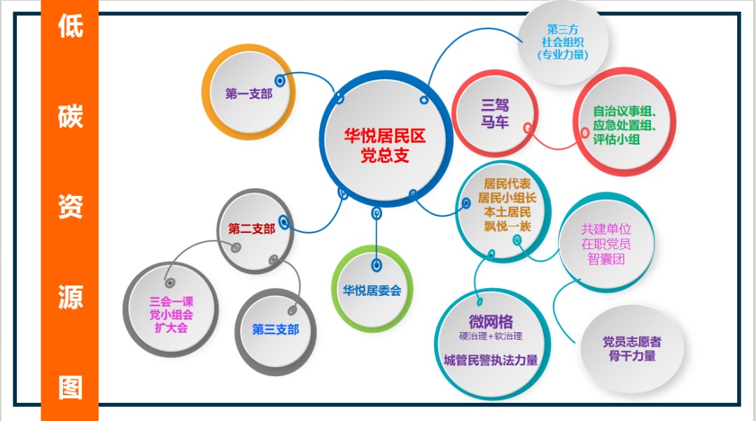 “真的像摸着石头过河。”回忆起争创初期,华悦家园党总支书记陈近清感慨万千。为了厘清思路,更好地开展工作,陈近清向内挖掘社区资源,向外寻求专业支持,绘制了一张低碳建设可用资源的思维导图,并在后续不断进行完善和补充。实践证明,这张资源图后来成为华悦家园低碳社区建设的重要思路指引。