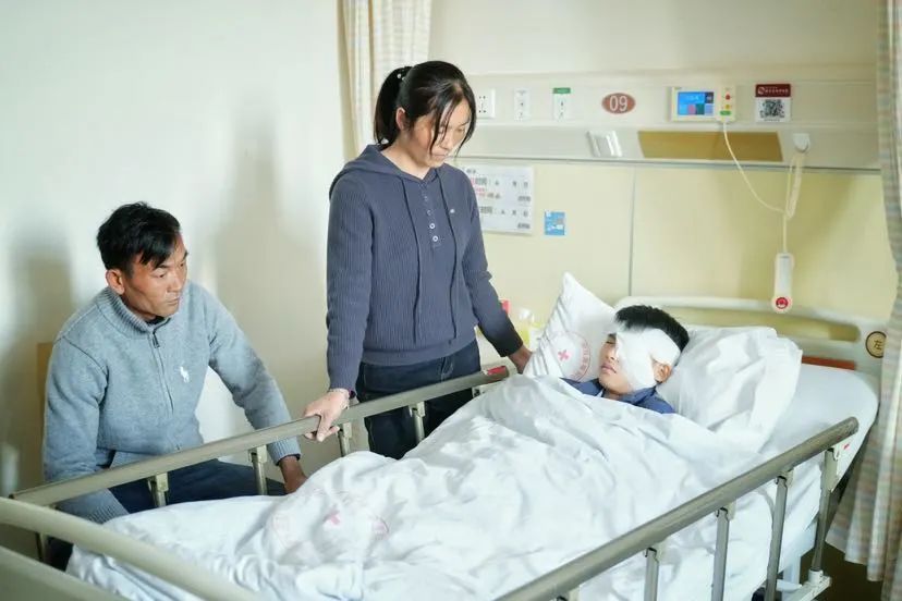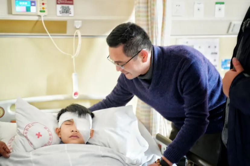 在医院,记者见到术后恢复中的少年杨显勇。他是云南普洱振太镇中心小学的三年级学生,三岁时左眼因意外受伤而导致失明,经过多次手术也未能恢复,家中因此负债十余万元。作为参与帮助杨显勇的爱心家庭,熊晟博一家在得知手术成功的消息后,带着满满的关怀与祝福,第一时间来探望他。