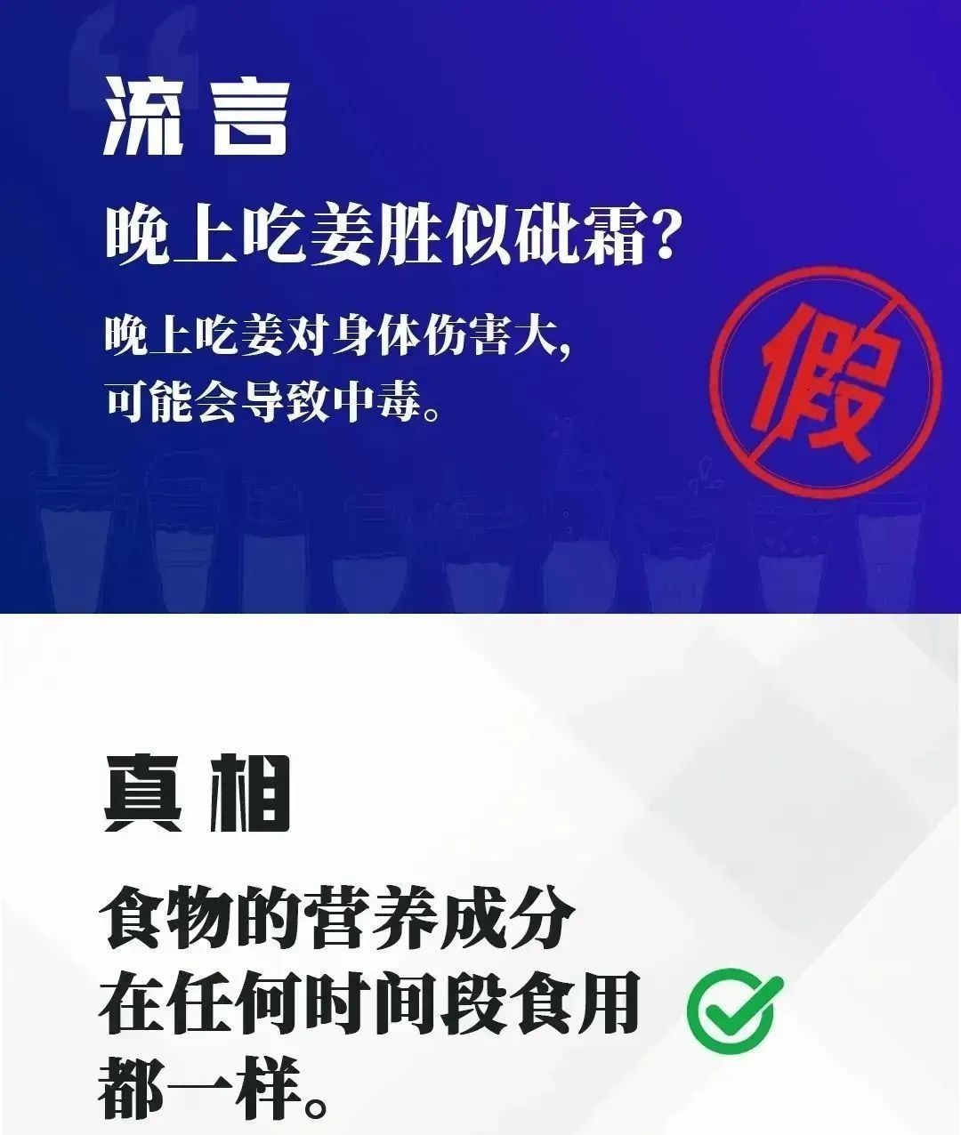 晚上吃姜胜似砒霜;骨折了躺着休息最安全酸奶越稠越有营养……这些流言你听过吗?真相又是什么?一起来看看↓↓↓ 01 晚上吃姜胜似砒霜? 真相:任何时段食用都一样! ▼生姜中的姜辣素可能会影响睡眠 从营养学角度来看,食物的营养成分在一天中的不同时段并无显著变化,其安全性亦不受时间影响。因此,无论是早上还是晚上食用,食物本身并不会产生毒性。 关于“晚上吃姜会影响睡眠”的说法,主要源于生姜中的姜辣素成分。姜辣素对人体心脏和血管具有刺激作用,食用后可能导致心跳加速和血管扩张,进而使部分人产生“燥热”感,影响睡眠质量。然而,这种影响并不构成对身体的实质性危害。 此外,生姜在日常饮食中通常作为调味品或用于制作姜汤,使用量相对较小。因此,即便是晚上食用,也不必过分担心其对身体产生负面影响。 02 骨折了躺着休息最安全? 真相:适当锻炼对恢复非常重要! ▼骨折康复需谨慎,长期卧床非良策 骨折后,患者确实需要充分休息,但并不意味着完全卧床静养就是最佳方式。 事实上,长期卧床可能引发一系列问题,如肌肉萎缩、关节僵硬以及血液循环不畅,严重时还可能增加血栓形成的风险。 ▼适当活动能促进血液循环和组织愈合 科学的骨折治疗需要根据骨折的具体情况,如类型、部位和严重程度,来选择合适的治疗方式。通常,医生会建议患者进行影像学检查,并根据结果采取复位、固定或手术等方法进行治疗。在治疗过程中,医生会依据患者的恢复阶段,鼓励其进行适当的活动,以促进血液循环和组织的愈合。 适当的功能锻炼对于骨折后的骨骼重建和功能恢复至关重要。在骨折得到妥善固定后,医生会根据患者的恢复情况,逐步推荐进行康复训练,旨在帮助患者尽早恢复日常活动能力。 03 长时间在寒冷环境中会冻伤? 真相:冻伤取决于多种因素! 冻伤的发生不仅与长时间的寒冷环境暴露有关,短时间的极端低温接触同样可能造成伤害。其发生机制涉及温度、湿度、风速及暴露时长等多重因素的共同作用。 即便在相对温暖的条件下,若皮肤长时间接触低温物体(例如金属表面)或手脚长时间处于湿冷状态、血液循环受阻,也有可能引发局部冻伤。 冻伤的本质在于皮肤和深层组织因低温而发生损伤,初期症状可能包括皮肤发红、感觉麻木及刺痛,严重时甚至可能导致组织坏死。预防冻伤的关键在于及时采取保暖措施。无论在何种温度下,一旦进入寒冷环境,都应注重保暖,避免皮肤直接接触冰冷物体。 04 酸奶越稠越营养? 真相:酸奶浓稠度于营养无关! ▼酸奶选择需参考营养标签 酸奶的浓稠程度主要由其制作工艺和可能添加的食品添加剂决定,但这并不直接反映其营养价值。酸奶的制作工艺分为凝固型和搅拌型两种,前者质地浓稠,后者相对稀薄。此外,增稠剂的添加也会影响酸奶的稠度。 在选择酸奶时,消费者应当关注产品上的营养标签,优先考虑含糖量低、蛋白质含量高的选项。稠度并非衡量酸奶营养价值的可靠指标,因此不应仅凭此来做出购买决定。