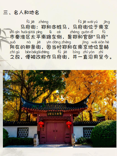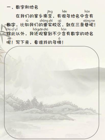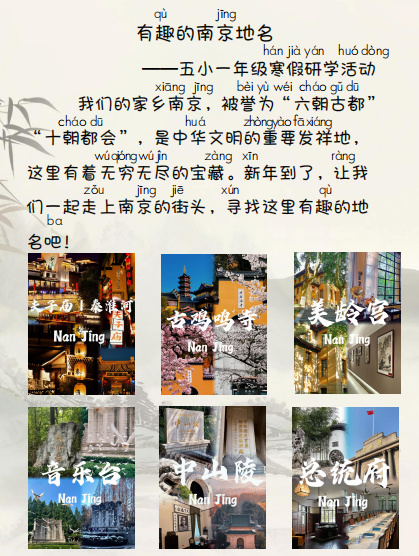 南京市五老村小学一年级精心制作了“金蛇探宝记”手册,围绕“有趣的南京地名”开展寒假研学活动。孩子们走上南京的街头,寻找这里有趣的地名。如,含有数字的地名、古诗中的地名、名人和地名。通过观察、实地拍照、写一写画一画,探寻家乡的文化宝藏。