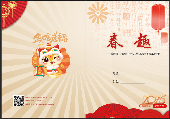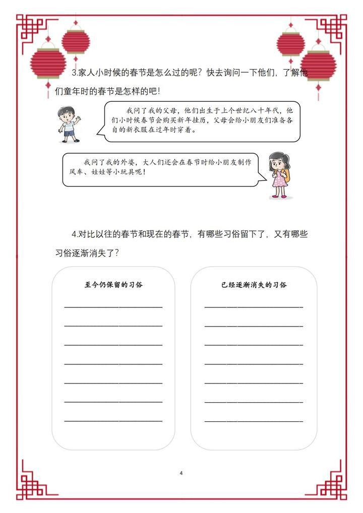 这个寒假,南京师范大学附属中学新城小学设计了“春趣”跨学科系列活动。这一系列活动从观察“春节”文化现象起步,逐步深入到探寻其背后的文化意象,并最终致力于积极传承与发展“春节”文化。《春趣》手册主要负责人江腾飞告诉记者:整个活动流程既保持了内容的内在联系,又呈现出清晰的进阶与发展脉络,充分体现了课程内容的连贯性和层次性。具体而言,活动分为低年级的“迎·春节”、中年级的“探·春节”以及高年级的“珍·春节”三个阶段——一年级是“找找童谣中的年味”;二年级是“置办年货过春节”;三年级是“舌尖上的美味:年夜饭制作体验”;四年级是“喜迎新春,绿意盎然:选择一盆植物迎春节”;五年级是“探寻童年记忆,书写年味增强指南”,六年级是“南京的春节:习俗互融倡议书”。