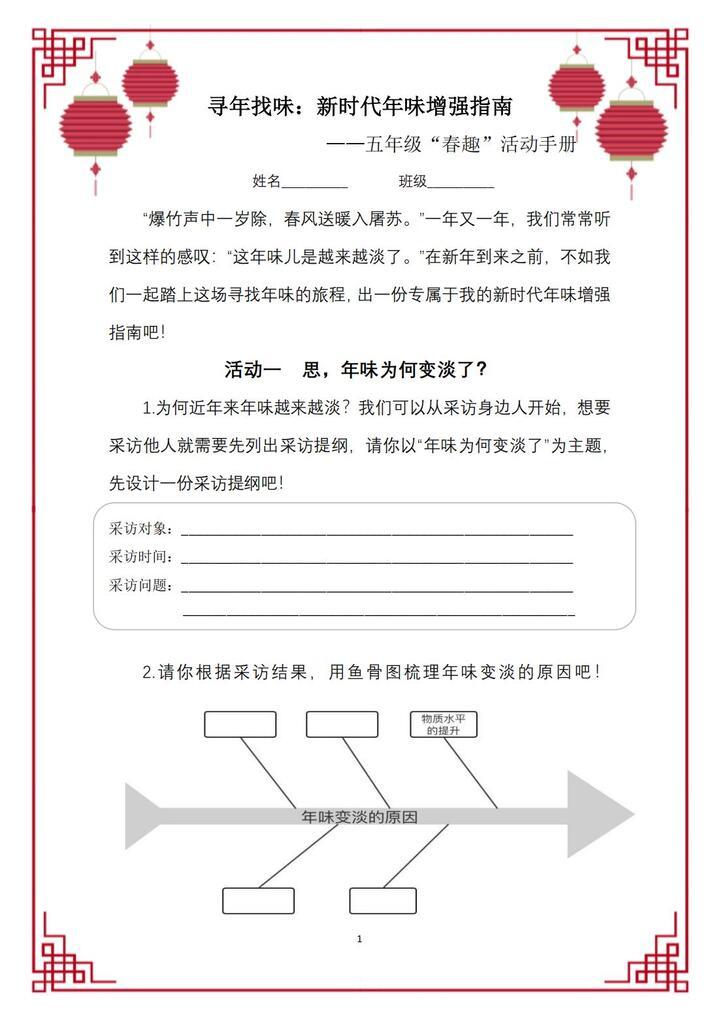 春节,这个承载着中华民族深厚文化底蕴的传统节日,随着时代的变迁,其庆祝方式也在不断地演变。对于新城小学五年级的同学们来说,这个春节将成为一个特别的探索之旅,他们将通过调查、访谈和记录的方式,深入了解祖辈、父辈童年时的春节记忆,并与自己的亲身体验进行对比,共同探寻那些被岁月珍藏的多样春节习俗,最终编写出一份充满情感与创意的“年味增强指南”。
