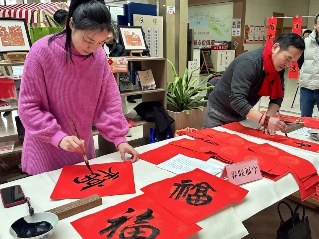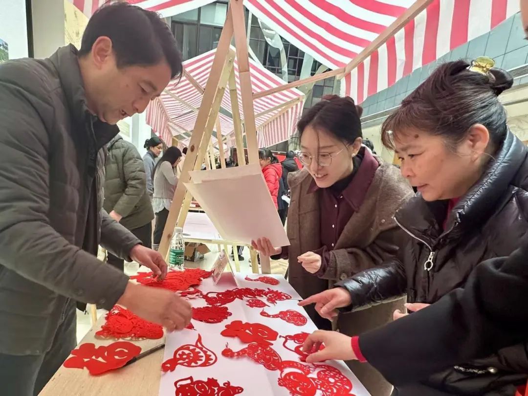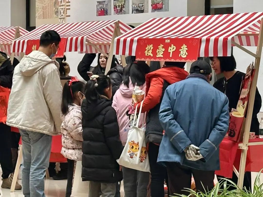 活动大厅熙熙攘攘,各类特色摊位吸引了不少居民围观。墨迹未干的春联、福字被悬挂起来,与大家脸上洋溢的笑容相互映衬。活动现场不仅有浓浓的年味,还安排了诸多非遗体验项目,如投壶、丝网版画、剪纸等传统文化体验活动。
