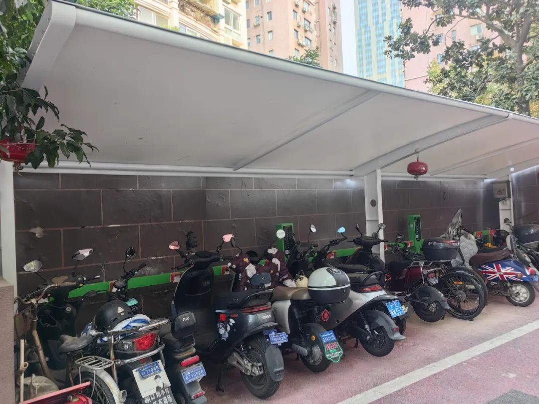 通过一段时间的施工,一个崭新的智能充电车棚“向新而生”,车棚的顶端采用了最新的防火布覆盖,加装了摄像探头,内设15个充电桩,居民可以通过扫描每个充电桩旁的二维码,选择对应的充电时间。这些充电桩装有智能断电等功能,万一在充电过程中发生过载、短路、漏电等情况,设备能够自动断电,做到了多重安全保护。