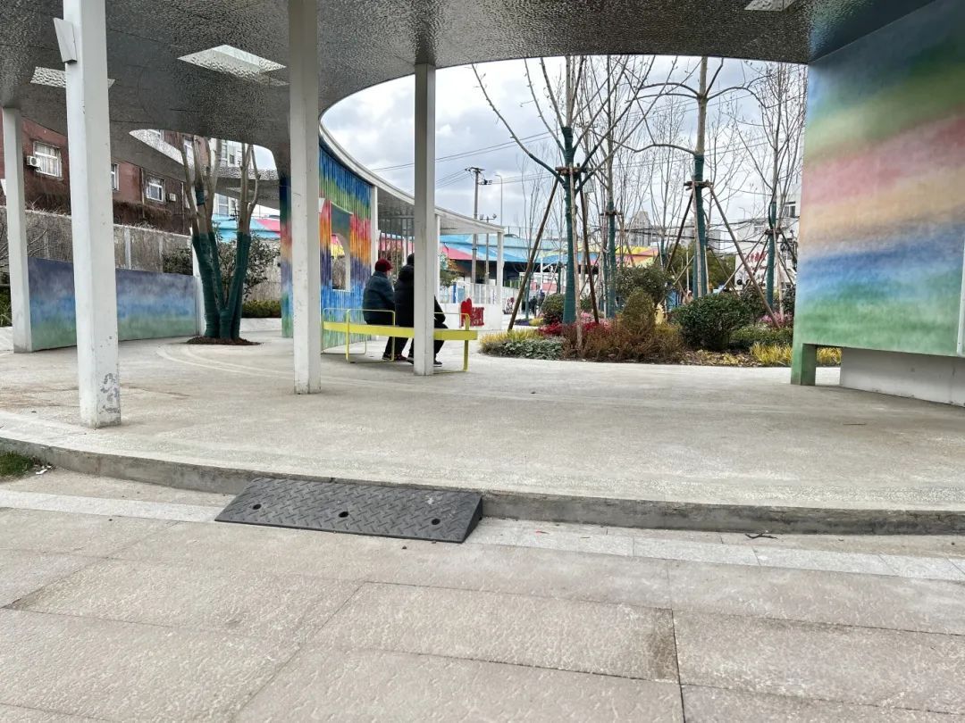 记者实地走访后发现,在绿地南端彩虹广场与健身步道过渡区域,以台阶衔接,存在约10厘米的落差,夜间灯光不足时,存在踏空风险。