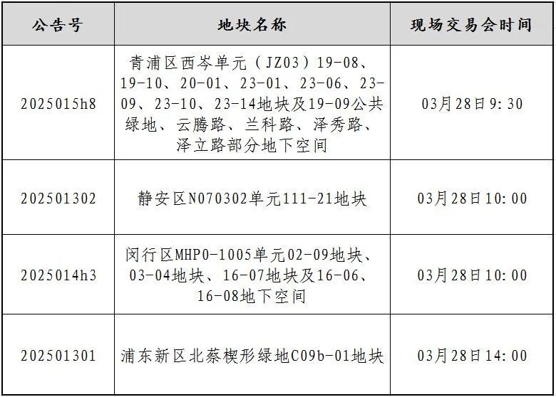根据《上海市国有建设用地使用权出让沪告字[2025]第013、014、015号公告》的规定,现确定该公告现场交易活动安排如下: