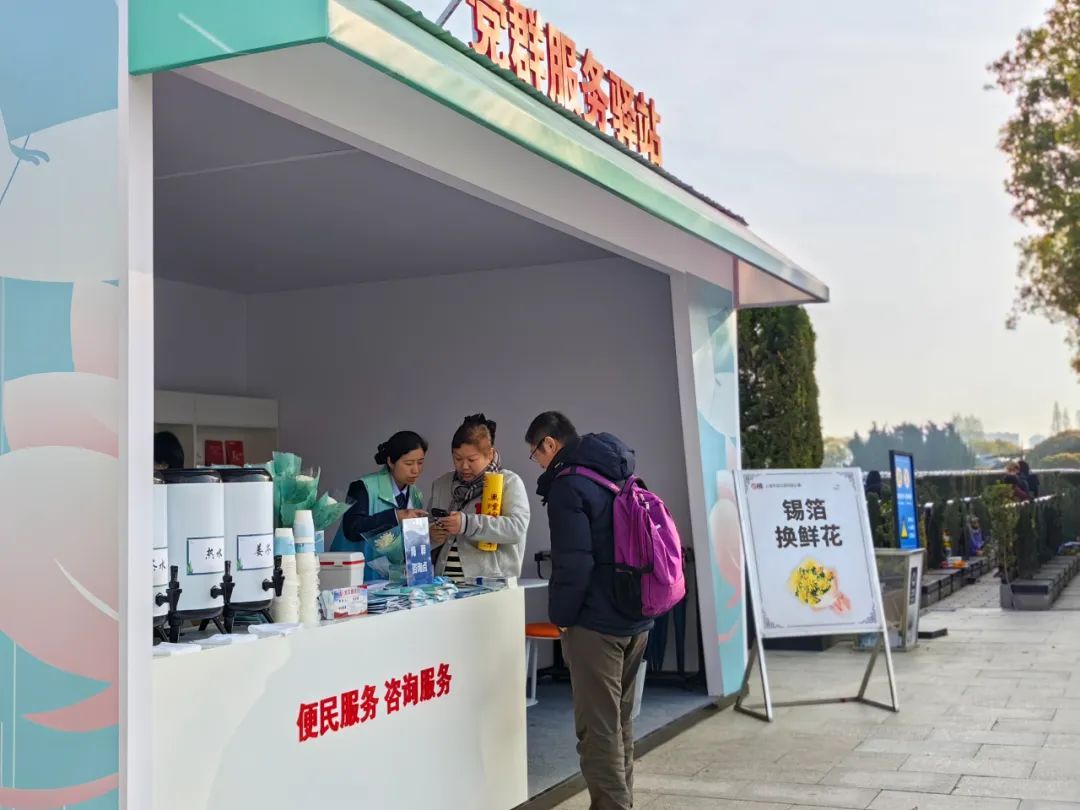 在上海淀山湖归园公墓,党群服务驿站格外醒目,党员志愿者们正忙碌地向市民分发文明祭扫指南,免费提供鲜花、茶饮、轮椅、充电宝等便民用品。为了更好地安抚市民的情绪,园区还安排了专业情感抚慰员提供心理疏导服务。