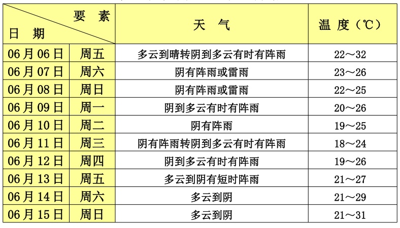 受梅雨带影响,未来一周本区以阴雨天气为主,其中9-11日梅雨带南压并减弱,本区处在梅雨带北部边缘,9日多云到阴有短时阵雨,10-11日阴到多云有时有阵雨或雷雨。7-13日本区气温起伏不大,最高气温24~27℃,最低气温18~23℃。