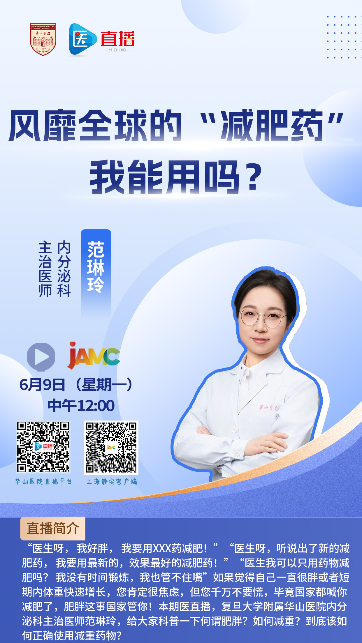 “医生呀, 我好胖, 我要用XXX药减肥!”“医生呀,听说出了新的减肥药, 我要用最新的,效果最好的减肥药!”“医生我可以只用药物减肥吗? 我没有时间锻炼,我也管不住嘴”如果觉得自己一直很胖或者短期内体重快速增长,您肯定很焦虑,但您千万不要慌,毕竟国家都喊你减肥了,肥胖这事国家管你!本期医直播,复旦大学附属华山医院内分泌科主治医师范琳玲,给大家科普一下何谓肥胖?如何减重?到底该如何正确使用减重药物?