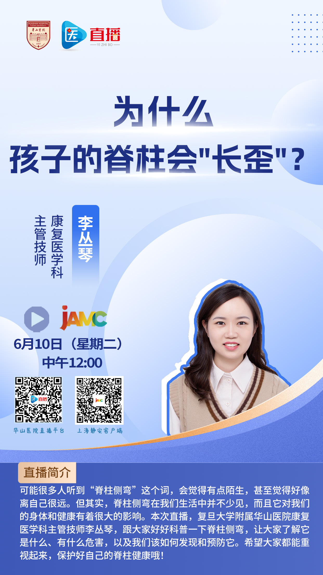 可能很多人听到“脊柱侧弯”这个词,会觉得有点陌生,甚至觉得好像离自己很远。但其实,脊柱侧弯在我们生活中并不少见,而且它对我们的身体和健康有着很大的影响。本次直播,复旦大学附属华山医院康复医学科主管技师李丛琴,跟大家好好科普一下脊柱侧弯,让大家了解它是什么、有什么危害,以及我们该如何发现和预防它。希望大家都能重视起来,保护好自己的脊柱健康哦!