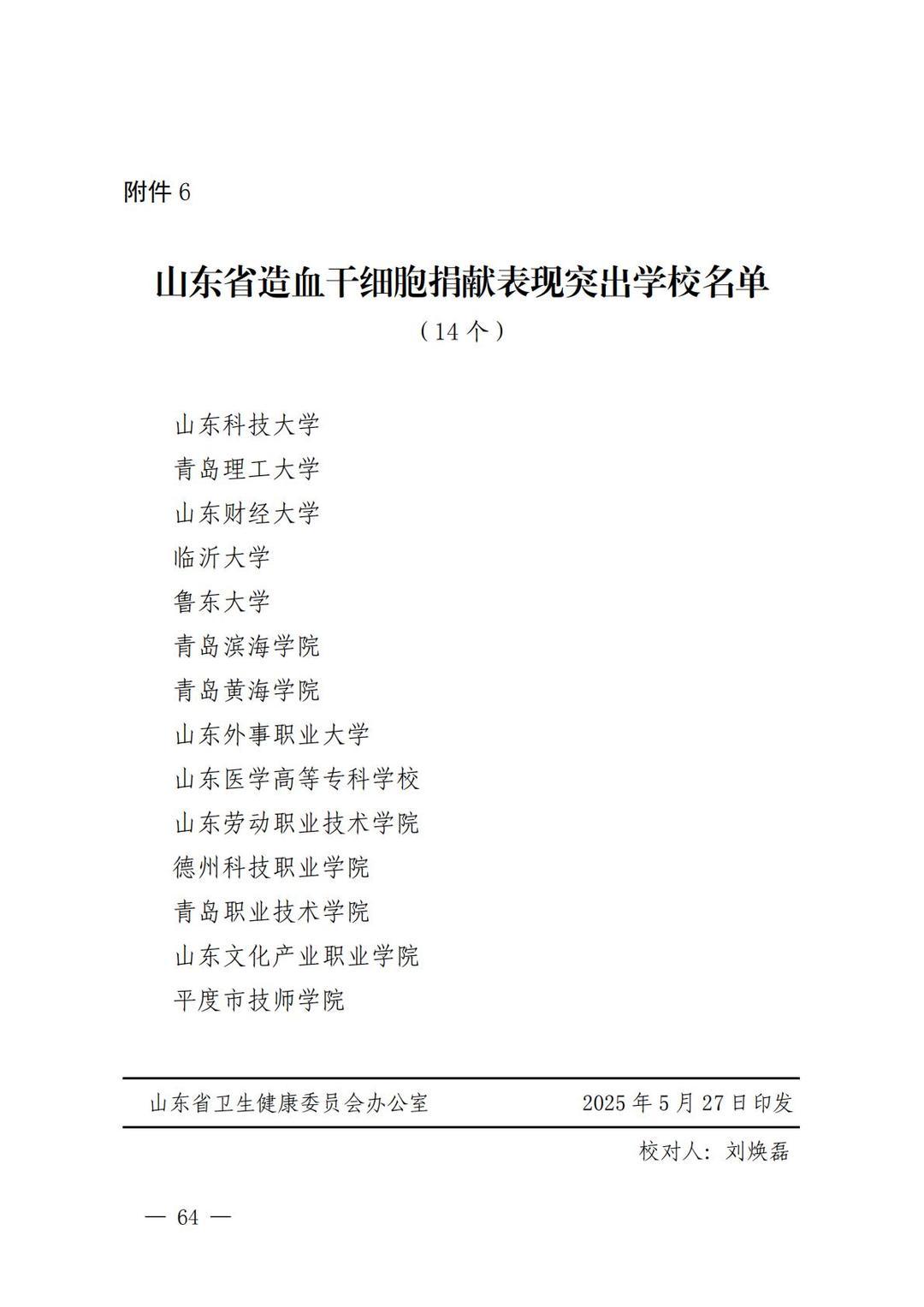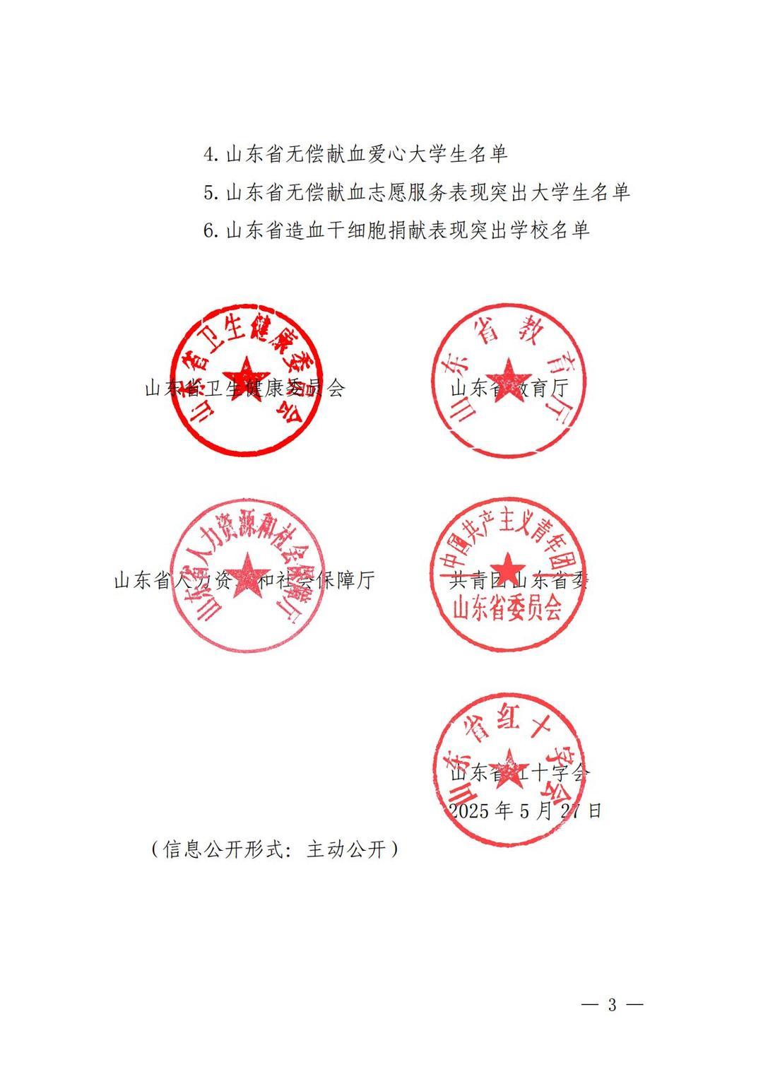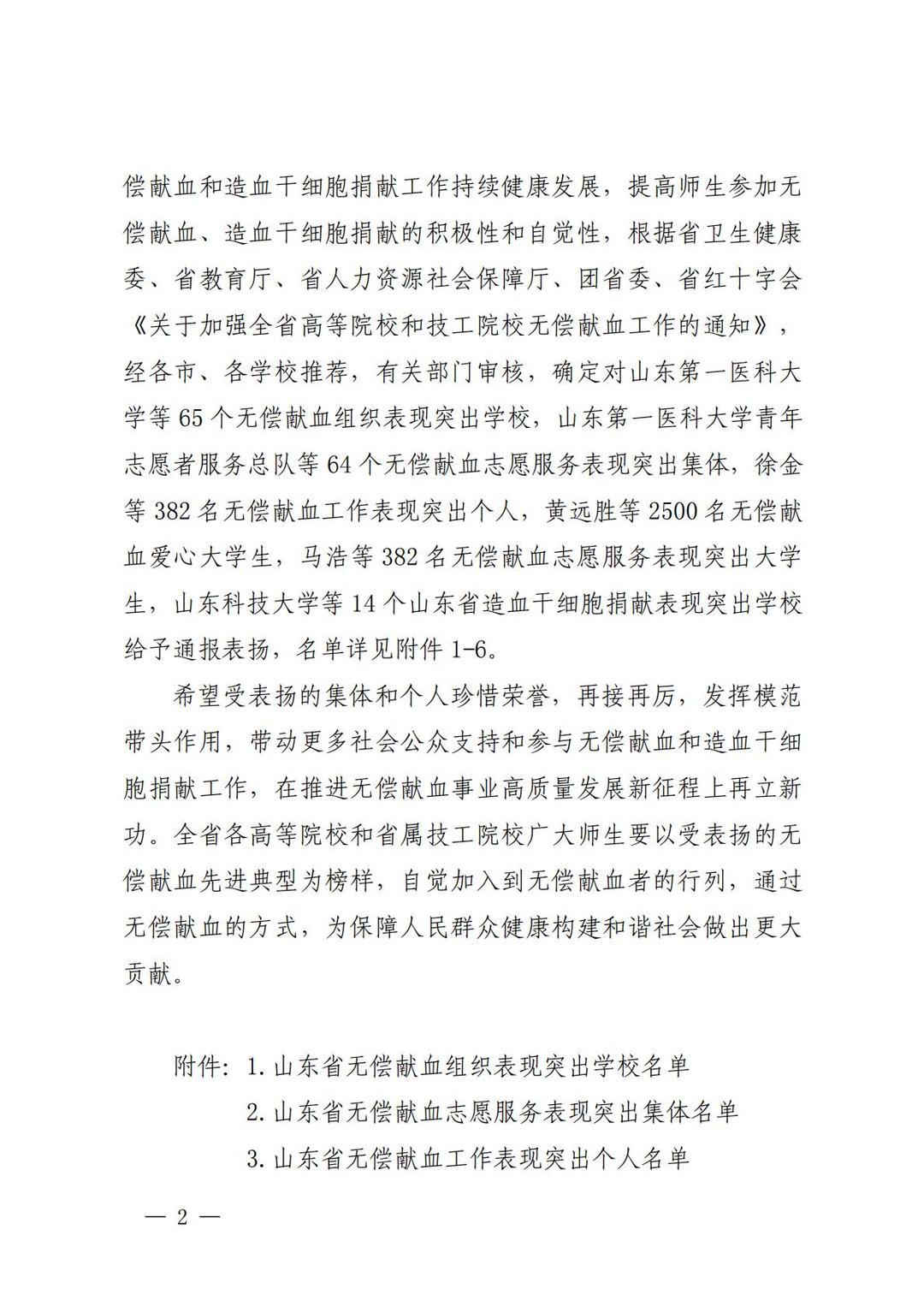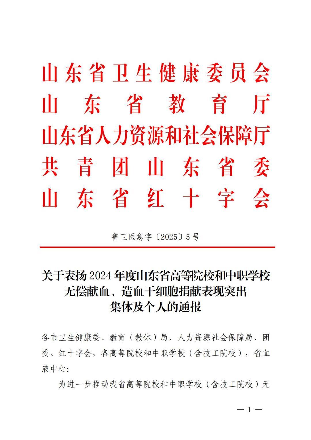 近日,山东省卫生健康委、省教育厅、省人力资源社会保障厅、团省委、省红十字会等五部门联合发布《关于表扬2024年度山东省高等院校和中职学校无偿献血、造血干细胞捐献表现突出集体及个人的通报》,确定对山东第一医科大学等65个无偿献血组织表现突出学校,山东第一医科大学青年志愿者服务总队等64个无偿献血志愿服务表现突出集体,徐金等382名无偿献血工作表现突出个人,黄远胜等2500名无偿献血爱心大学生,马浩等382名无偿献血志愿服务表现突出大学生,山东科技大学等14个山东省造血干细胞捐献表现突出学校给予通报表扬。
