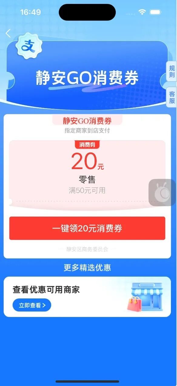 线下成功领取“静安GO消费手环”的用户,可登录支付宝App搜索“静安购”,领取满50元减20元专属优惠券,覆盖餐饮、零售等多领域商户。