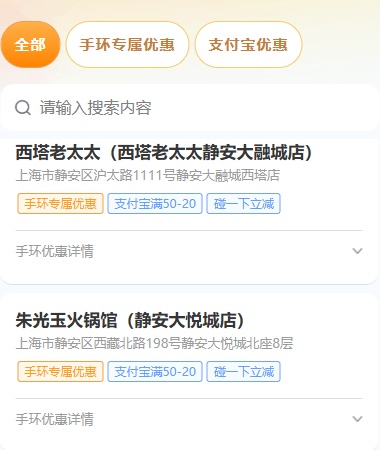 1.在静安文旅商体展联动平台首页查看“商户分类”,可查看带有专属标识的商户,用户凭手环和支付宝优惠券可前往商户享受对应优惠。优惠有限,送完即止。