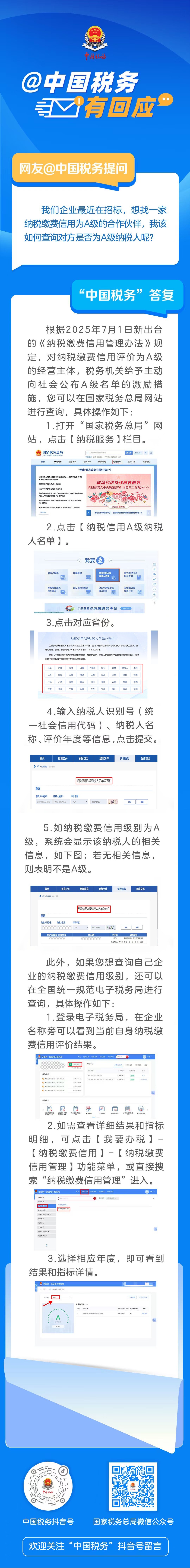 有网友问:“寻找合作伙伴,如何知道对方是否为A级纳税人呢?”一起来看看回复吧↓