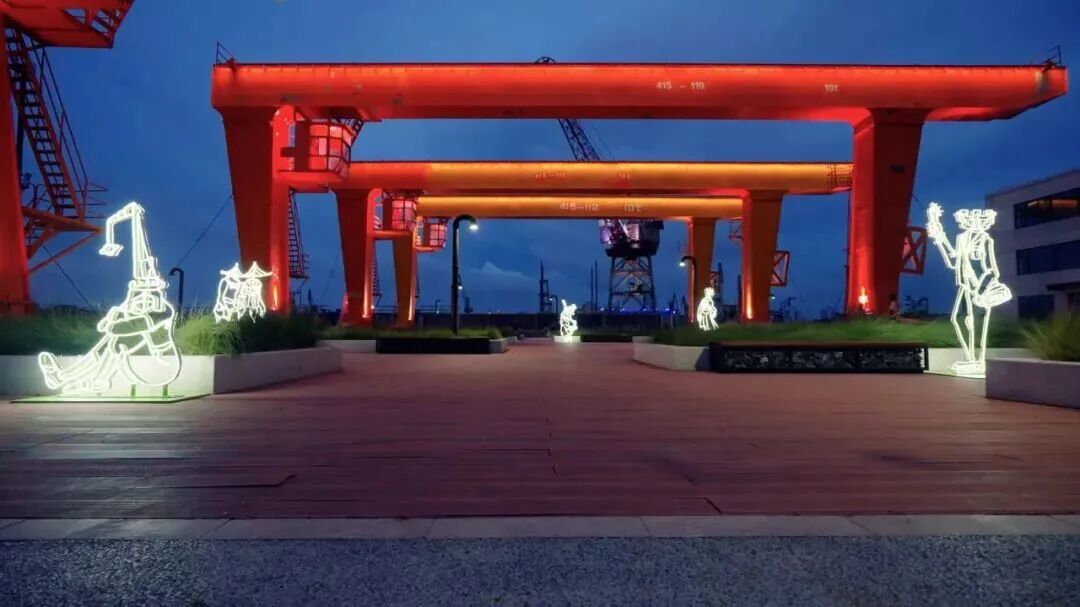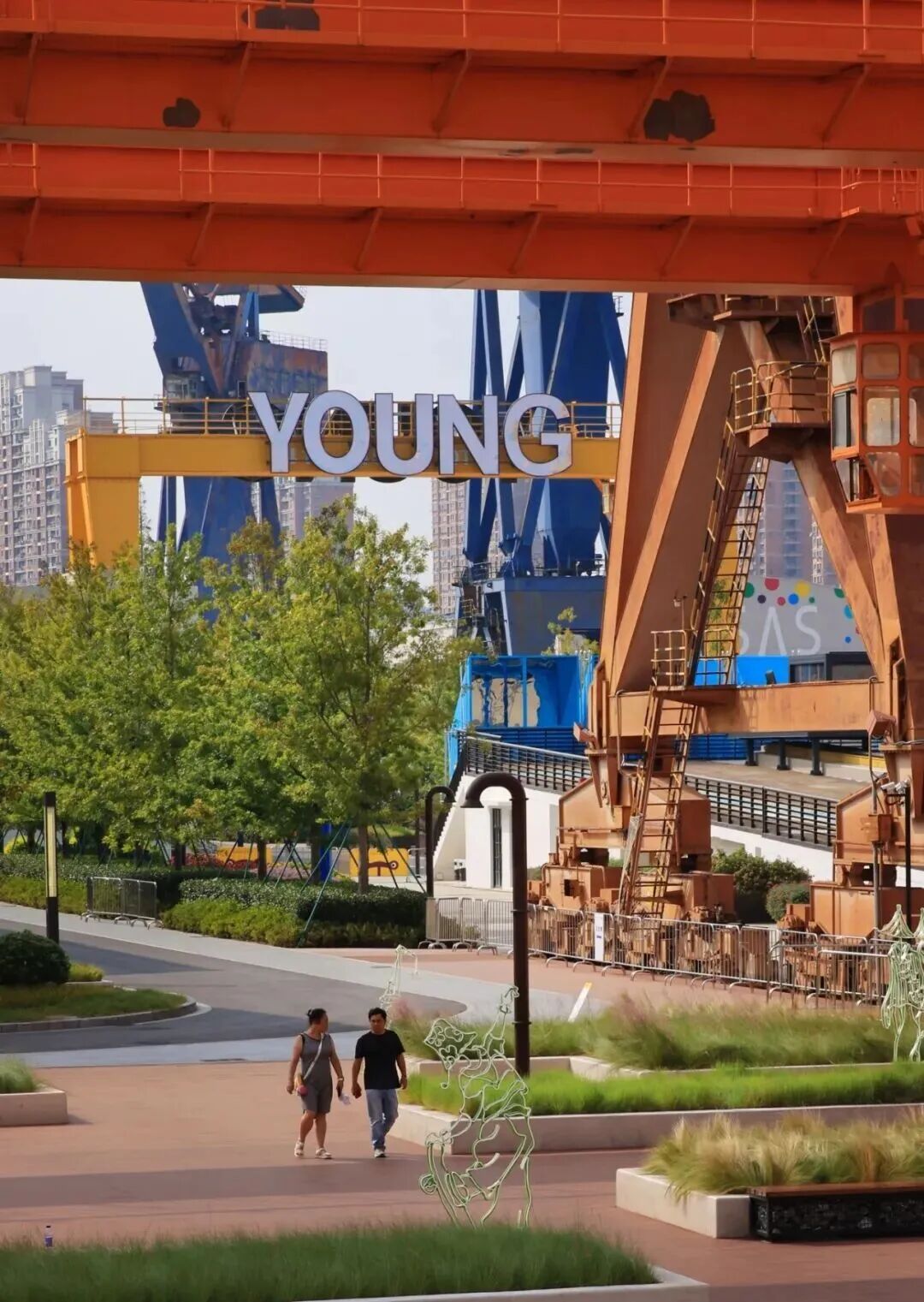 室外展区船台公园的首次亮相无疑成为最受瞩目的亮点之一,公园内保留的中华船厂巨型塔吊、超大尺度的造船船台以及黄浦江边开阔的高桩码头等工业遗迹与周围自然景观相互呼应,形成了工业与自然共生的独特空间。