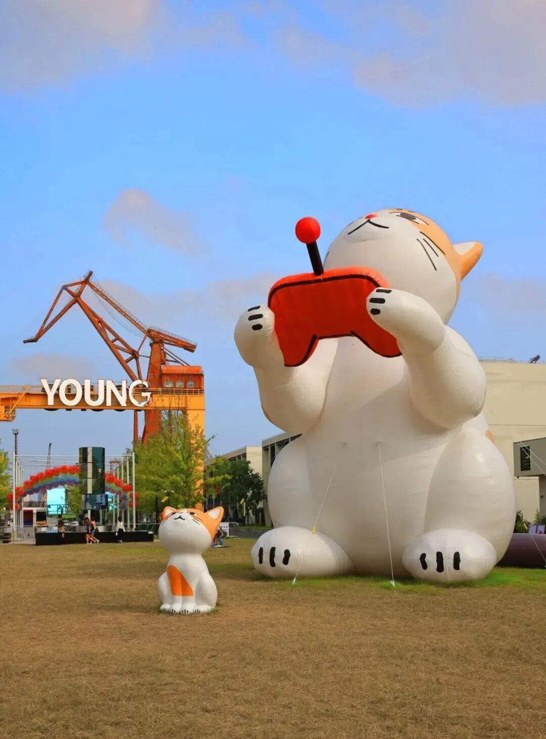 从地铁12号线复兴岛站2号口出来步行100米,就来到公园里的主展区,远远看到一只仰望天空的巨型“猫咪”。