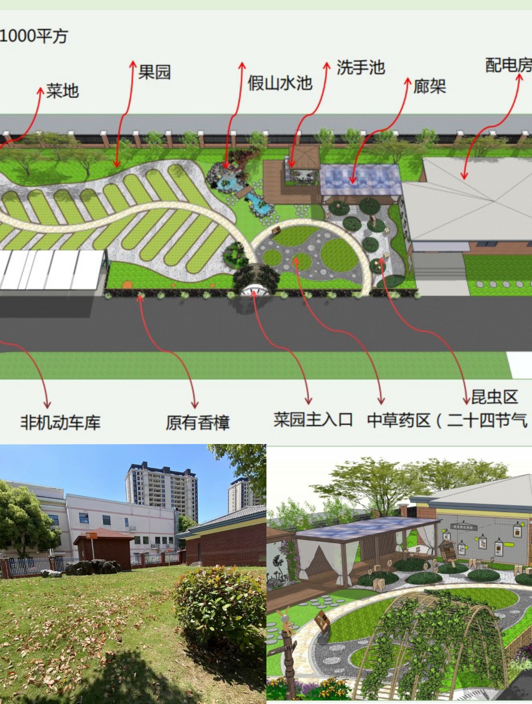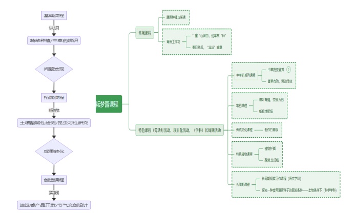2023年春季,学校统筹整合各方资源,在原有师资、空间、设施、设备等基础上,对校园南侧面积约1000平方米的绿地展开设计与改造,最终构建形成以蔬菜种植园、假山廊架休闲区、本草纲目主题区、二十四节气文化区、昆虫旅馆为核心脉络的跨学科学习空间——“耘梦园”。
