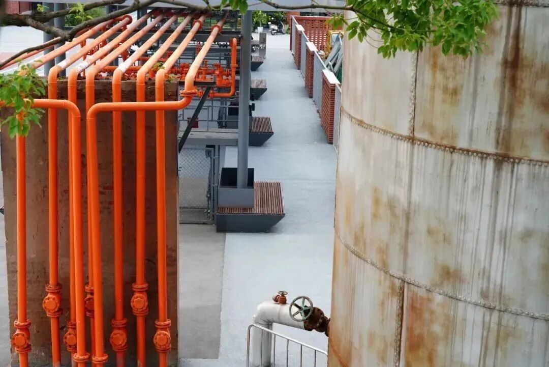 园内105米高的大烟囱是最具辨识度的标志,红白相间的色彩在蓝天下格外醒目。公园内散布着鹤嘴吊、煤斗亭、灰仓等工业遗存,如今都已成为自带滤镜的装置艺术。由电厂净水池改建的 “一尺之间”咖啡馆是个歇脚的好去处,坐在下凹的净水池咖啡厅,可以从顶部穹顶看到电厂的大烟囱,品味一杯独特的“零碳咖啡”,惬意又特别。