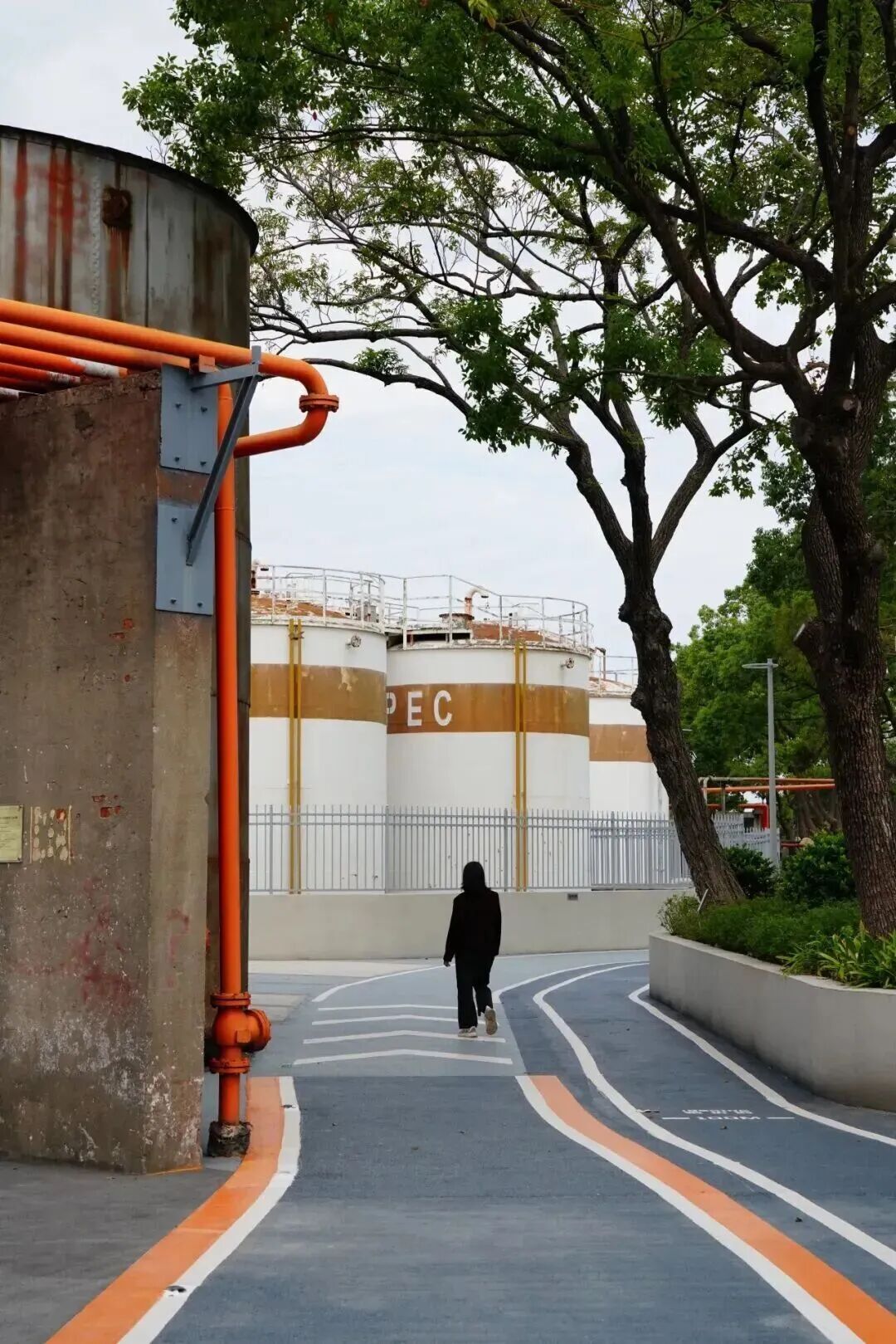 从上海国际时尚中心向西南方向漫步,一座“工业风”十足的油酷艺术公园近在眼前。这座占地近16000㎡的公园,前身是二十世纪初落地上海的洋商亚细亚火油公司站点,如今保留了大型立式旧油罐,斑驳锈蚀的罐体写满了能源发展的历史演变。