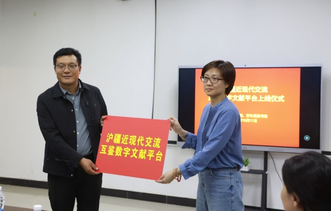 随后,图书捐赠仪式在图书馆会议室举行,双方负责人共同完成图书捐赠交接,并一同按下启动键,宣告“沪疆近现代交流互鉴数字文献平台”正式上线,为表达感激之情,莎车县图书馆相关负责人向上海图书馆赠送了锦旗。