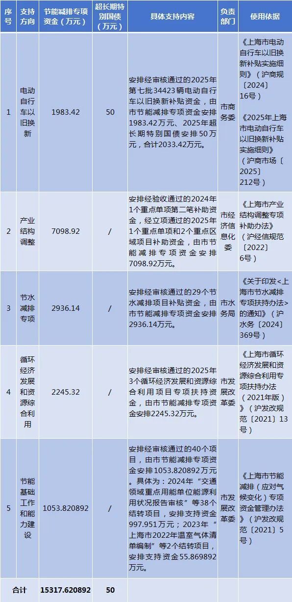 1. 按照《上海市电动自行车以旧换新补贴实施细则》(沪商规〔2024〕16号)、《2025年上海市电动自行车以旧换新补贴实施细则》(沪商市场〔2025〕212号)规定,安排经审核通过的2025年第七批34423辆电动自行车以旧换新补贴资金,由市节能减排专项资金安排1983.42万元、2025年超长期特别国债安排50万元,合计2033.42万元。