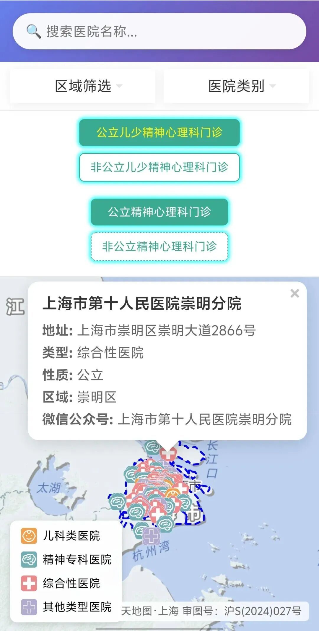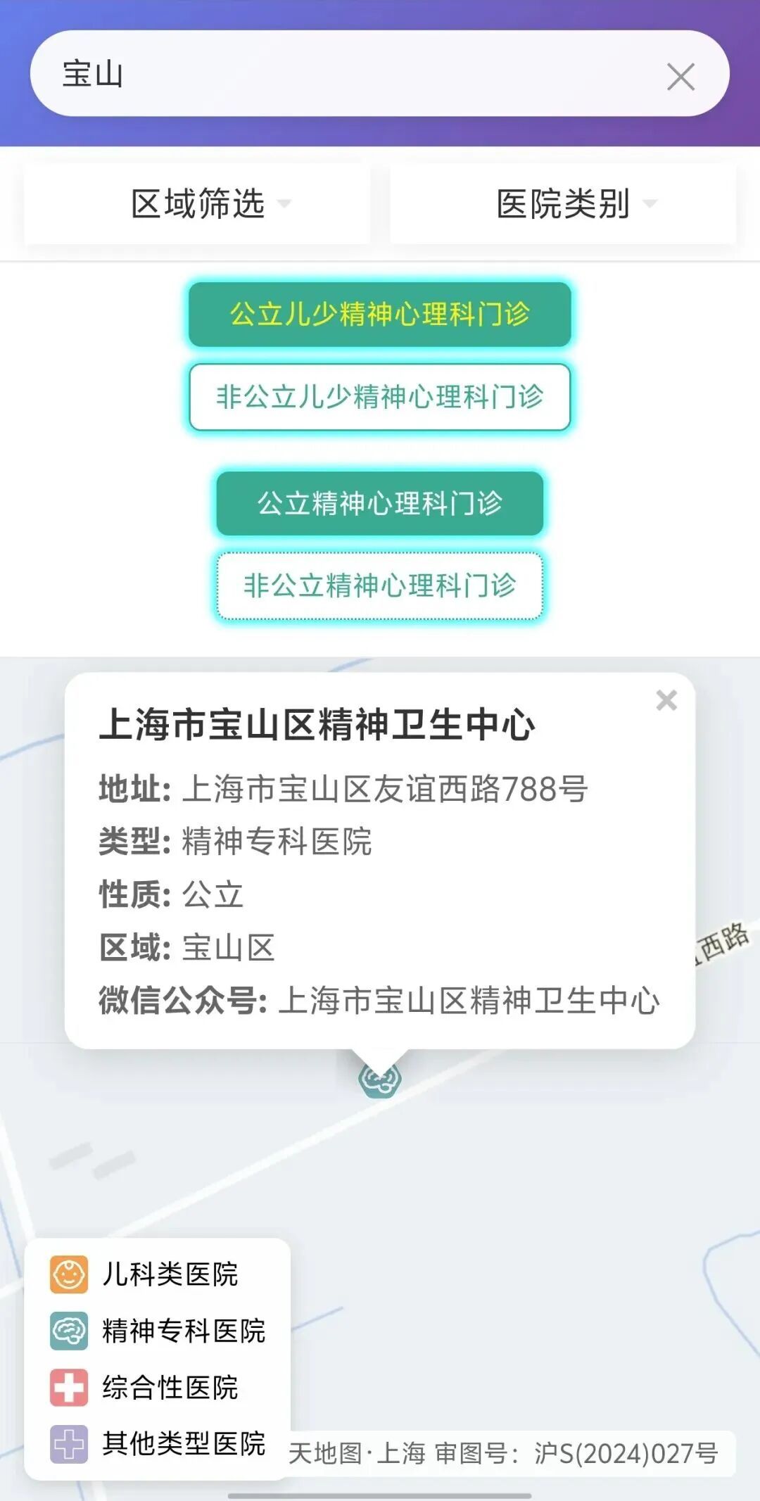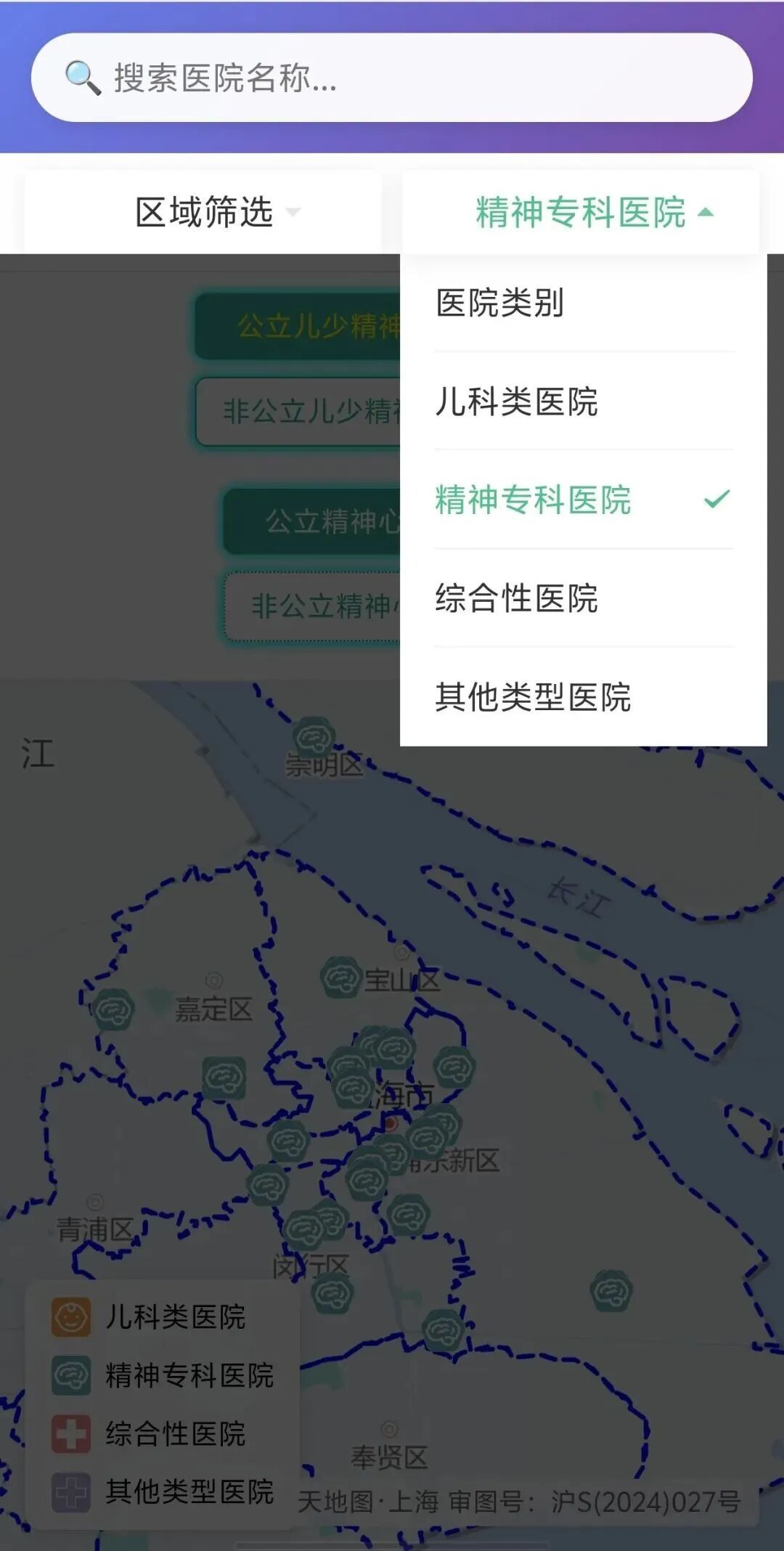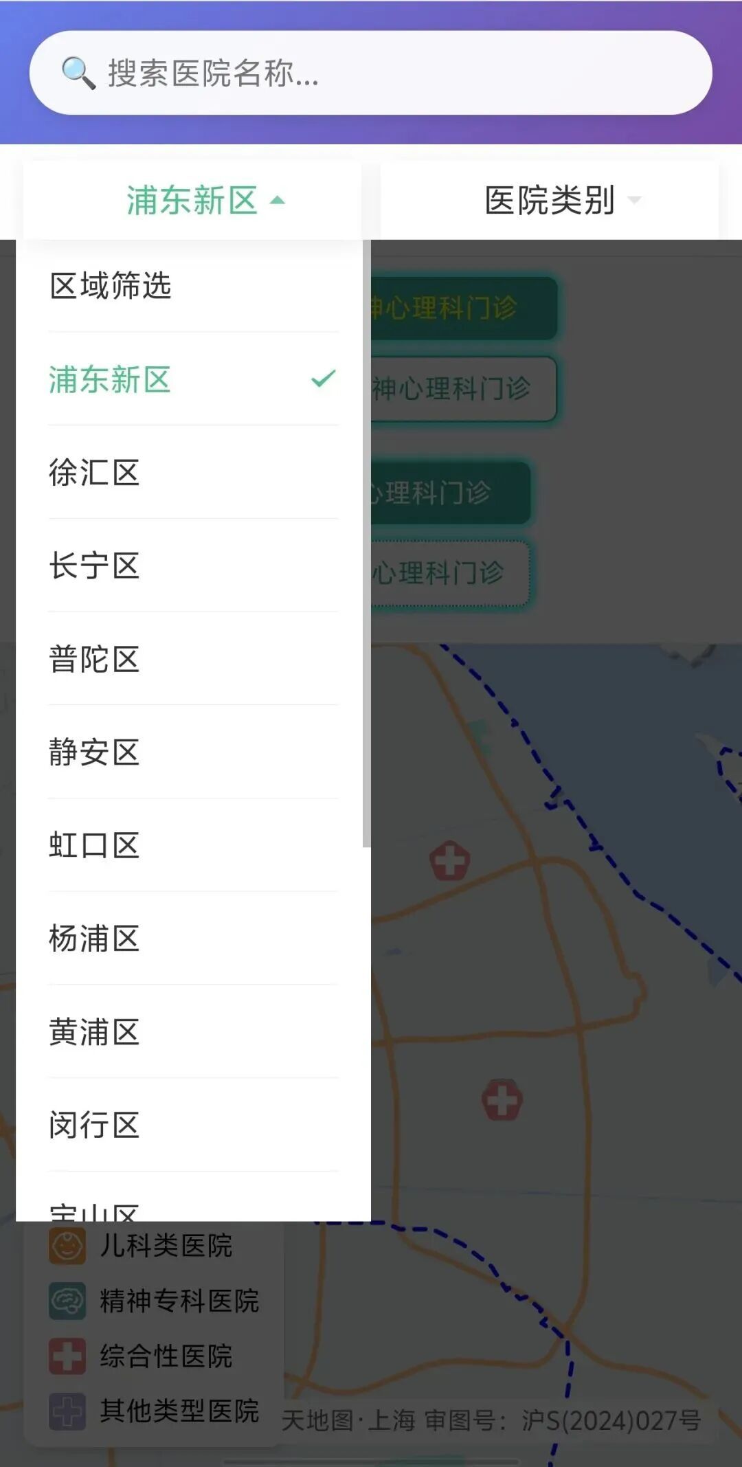 点击医院类别,您可以在弹出的菜单中勾选查看某一类型的服务机构。