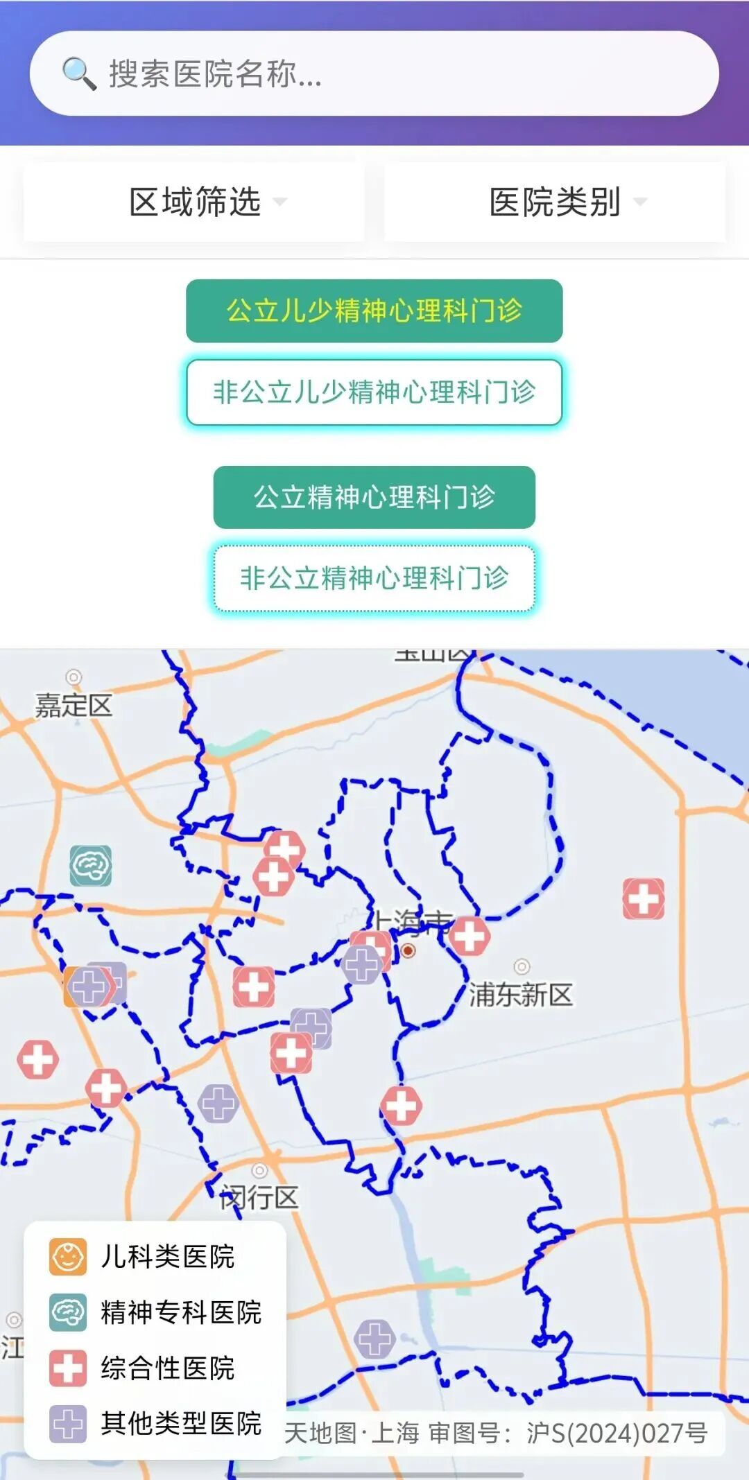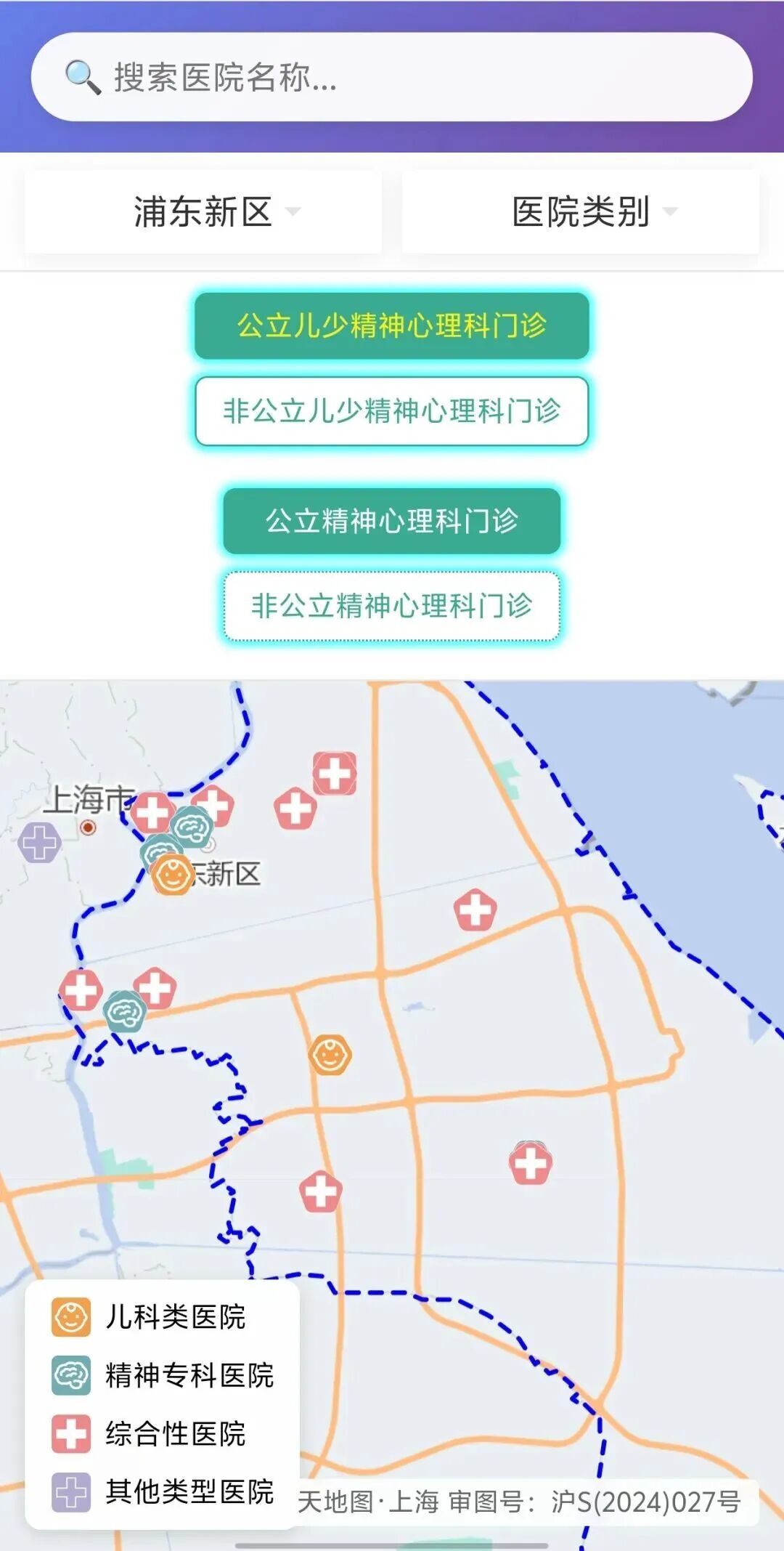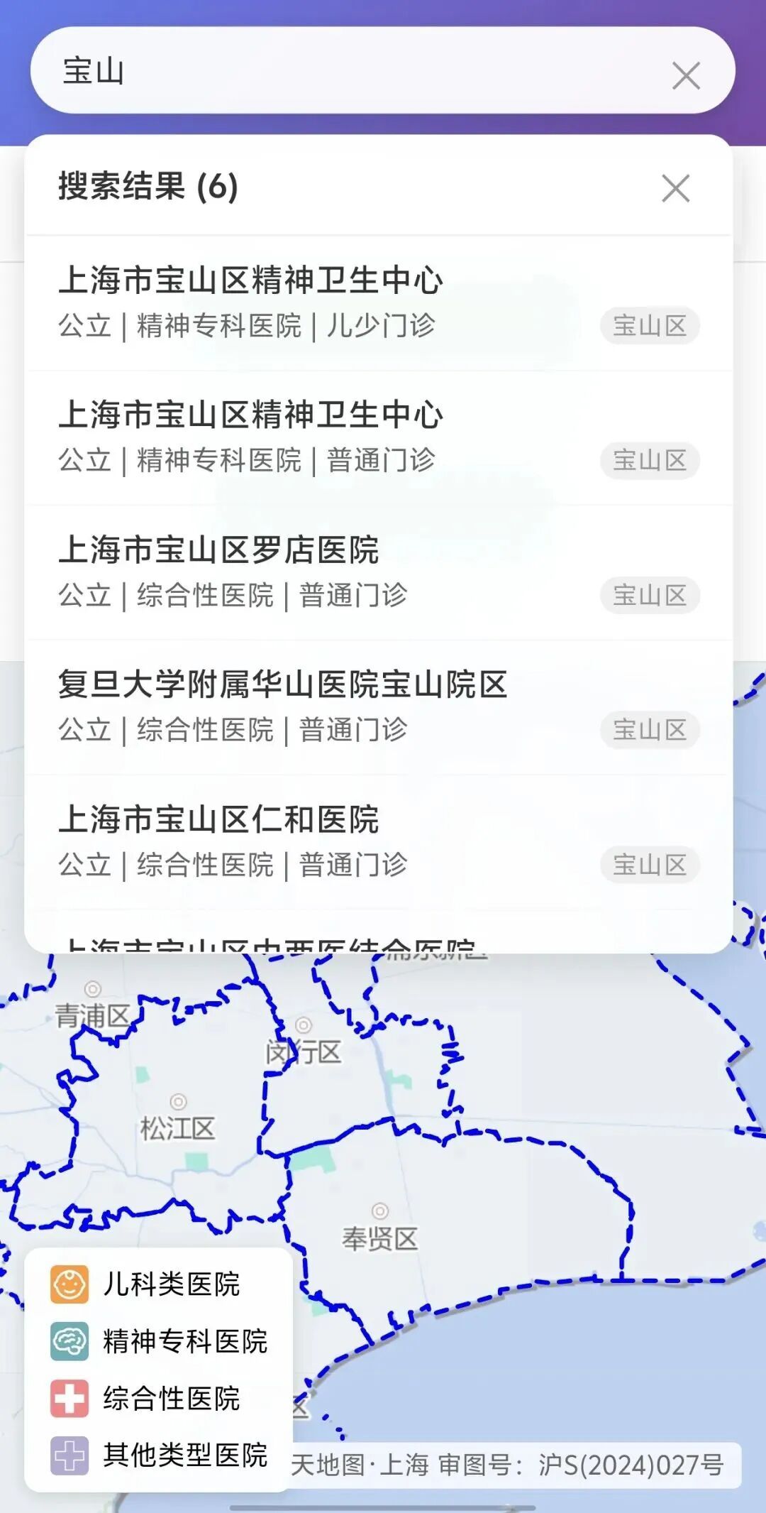 在搜索栏中输入医院名称,可定位至相应医院。