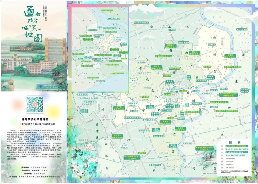 纸质地图有机融合了海派艺术名家汪家芳画作《忆秩普慈 赓续心篇》的风格与元素,清晰精确地标注了上海市12类儿少心理门诊服务机构,编织了一张温暖的心灵地图。图上的每一个点位,都化为心灵的坐标,为每一个家庭、每一颗年轻的心灵指引方向。