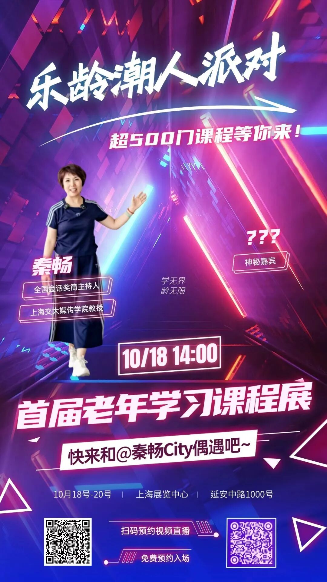 10月18日—20日2025首届上海老年学习课程展将在上海展览中心举行超过500门精彩课程等你来!10月18日(周六)下午2点金话筒主持人秦畅 将和活力达人一起沉浸式体验这场“乐龄潮人派对”!直播平台:@秦畅City 微信视频号、抖音号扫描海报二维码即可预约直播 & 报名免费入场