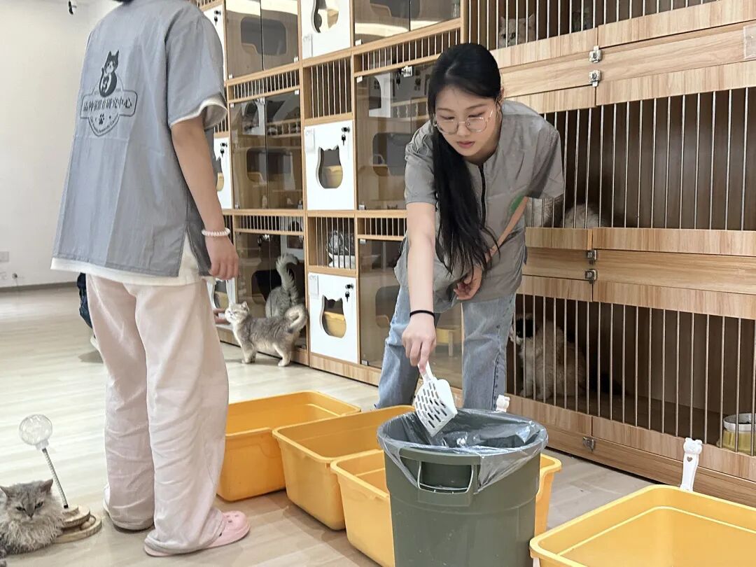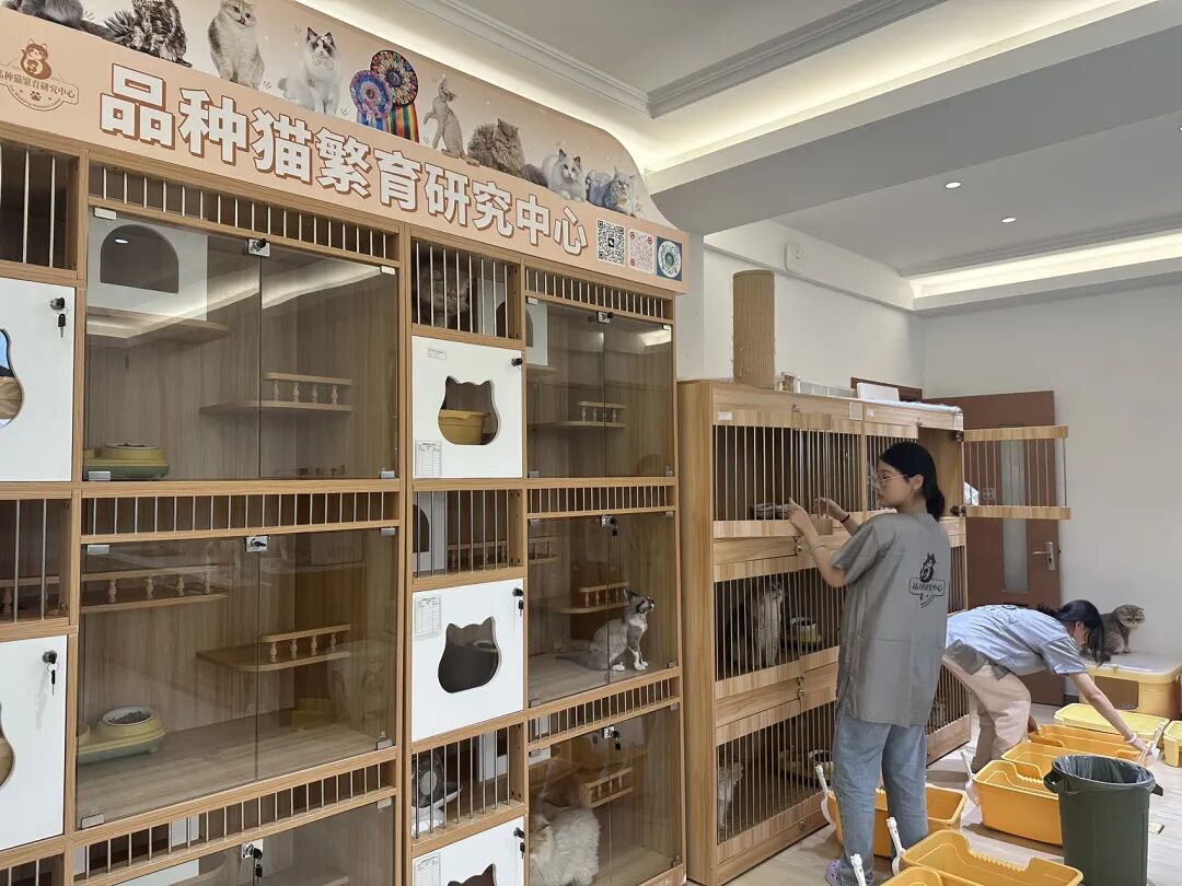 目前,品种猫繁育研究中心生活着约150只猫咪。这群可爱的“同学”,为学生带去满满的学习幸福感,但要学好相关技术,学生得经历一番辛苦的历练:每天到了猫舍,学生的第一个任务就是铲屎,还要通过观察粪便来了解猫咪的健康状况;碰上猫咪生产,学生可能需要彻夜守护猫妈妈和猫宝宝的安全……并不是所有报名学生都能坚持下来。为此,学校在组班后设置了一个月的考察期,只有真正坚定且适合的学生才能继续学习。