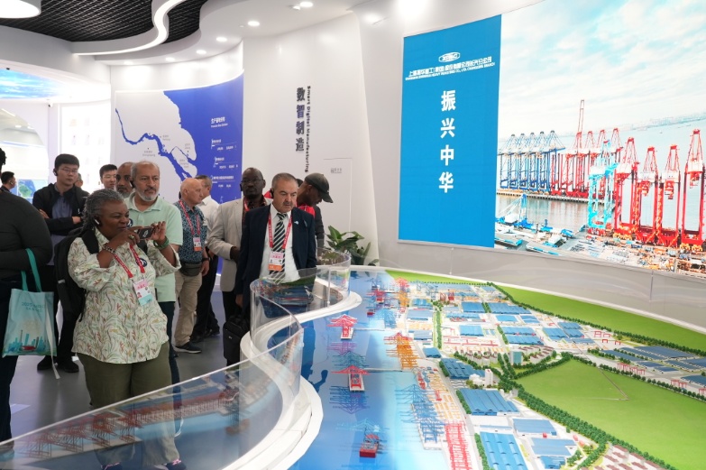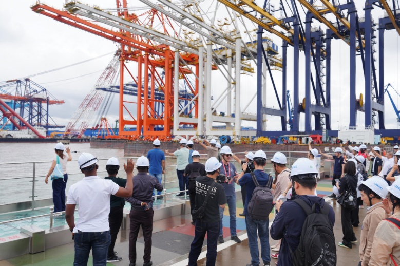 工作坊的首站,是让“中国制造”驰骋全球港口的巨头——上海振华重工。在数字化展示厅,外宾们通过动态模型与数据大屏,直观了解振华港机如何从长兴岛出发,服务全球。当讲解员提到“全球110个国家和地区正在运行的岸桥,每10台就有7台产自振华长兴基地”时,现场响起一片惊叹。有工程师忍不住追问负责人:“那么,这样的‘巨无霸’,你们一年究竟能生产多少台?”负责人报出的数字则引来更多赞叹,反映了中国在全球港机领域的硬实力。