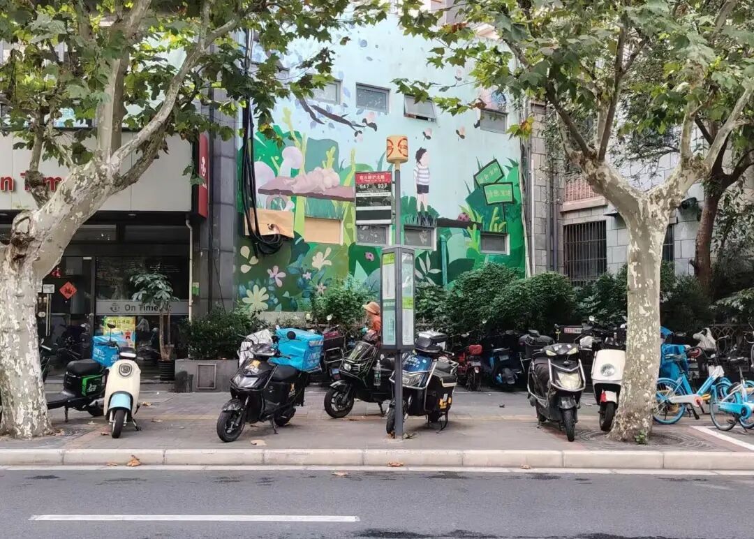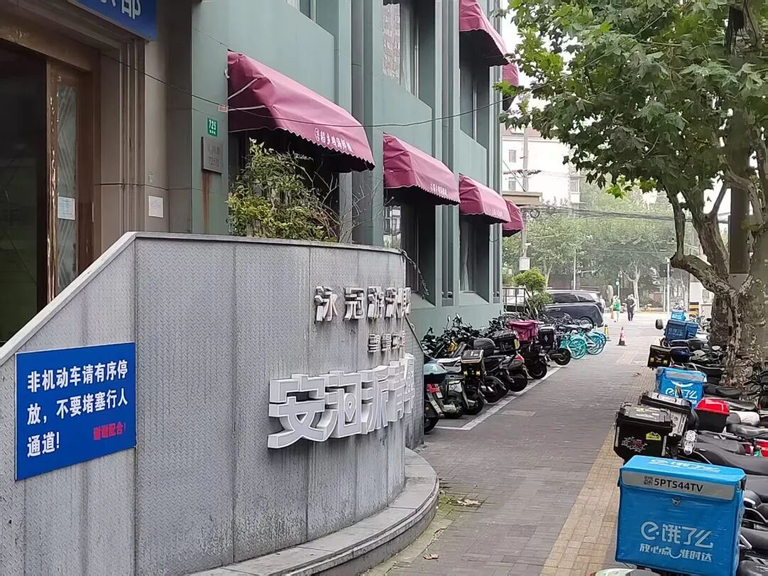 “宜川路两侧和附近的沪太路其实都有非机动车集中停放点,但是距离较远,快递、外卖员图方便,不愿意停过去。我们作为小区物业,管理权限很难延伸到围墙之外;想和公寓管理方协调,也一直找不到有效的沟通途径。”
