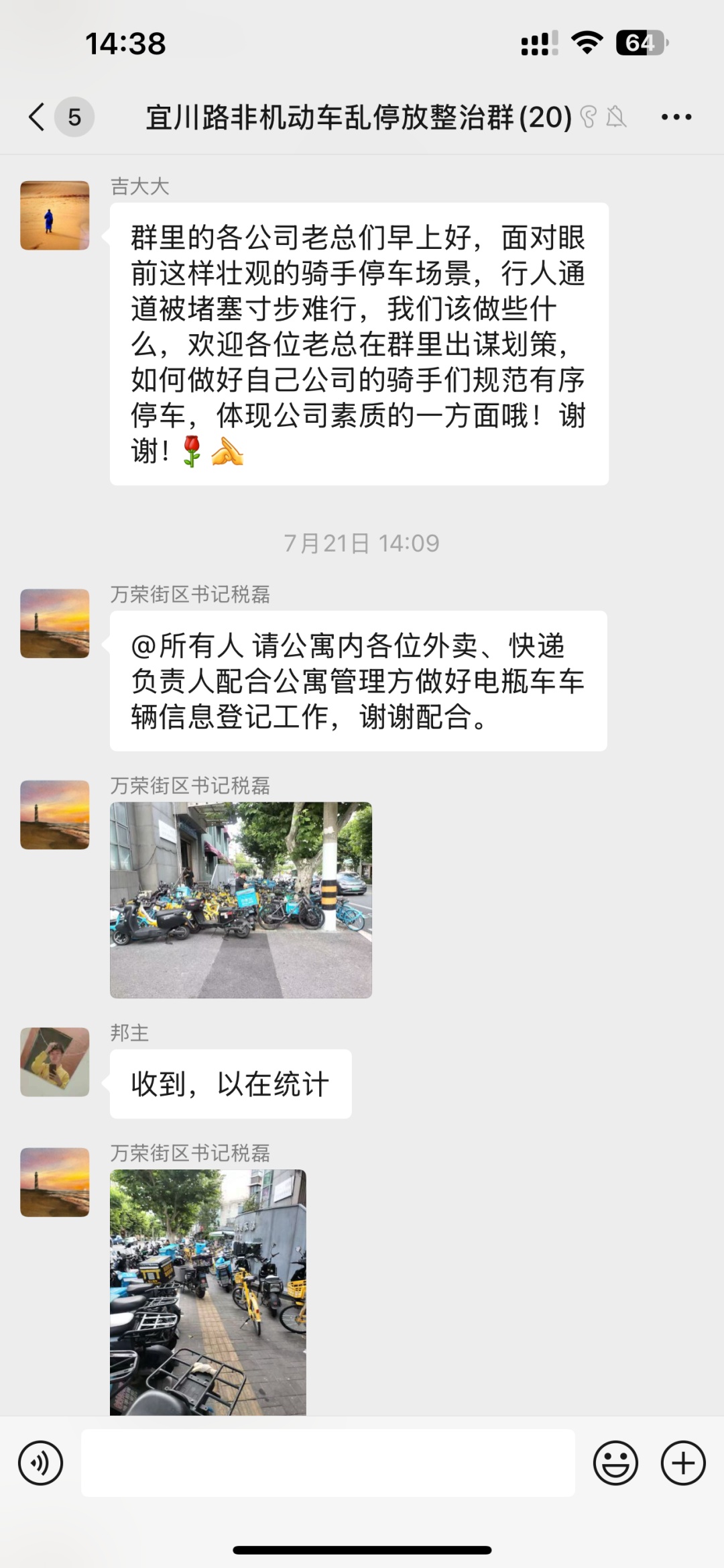 围绕管理痛点,由万荣街区党总支牵头约谈5家快递外卖公司、共享单车公司以及公寓方,建立了线上沟通渠道,将问题摆在台面上,并划分落实责任,定期对非机动车停放进行巡查、劝导和规范。