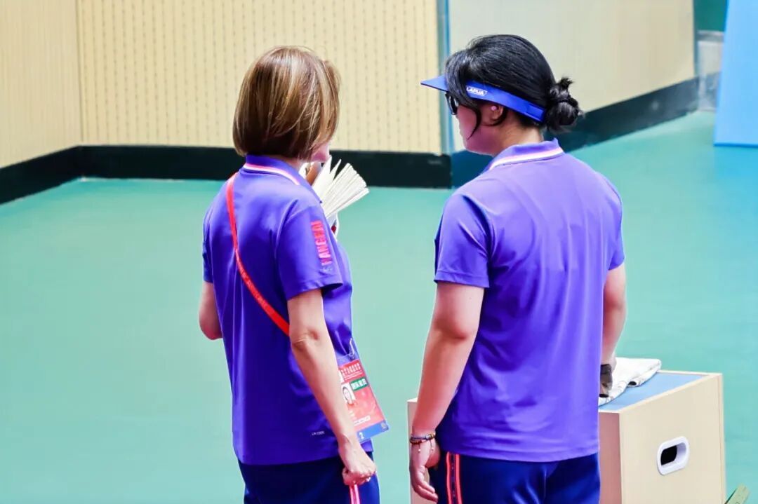 上海手枪队教练王莹(左)在金牌赛暂停中指导队员