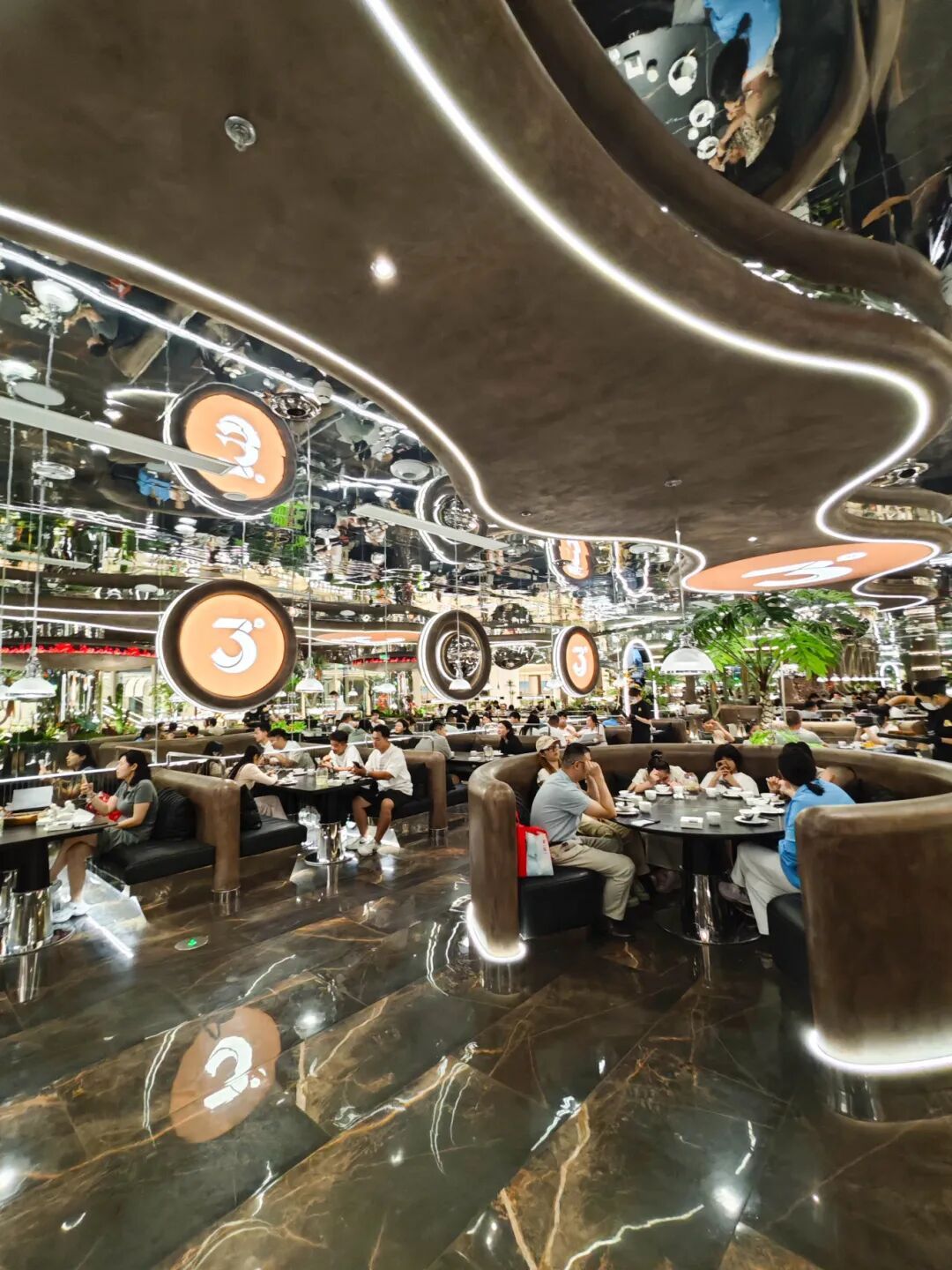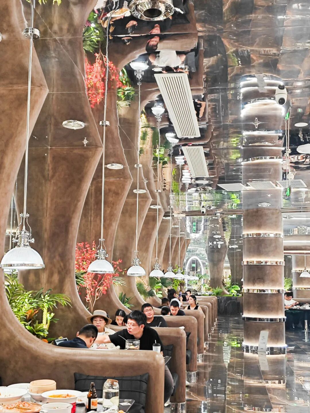 一走进餐厅,食客们就会被惊艳到,1680㎡的空间设计堪称一场沉浸式的视觉盛宴。店内以大面积镜面元素打造出无限延伸的未来感空间,金属质感的装置与环形灯光交相辉映,搭配错落其间的热带绿植,在虚实反射中构建出极具科幻感的就餐秘境。