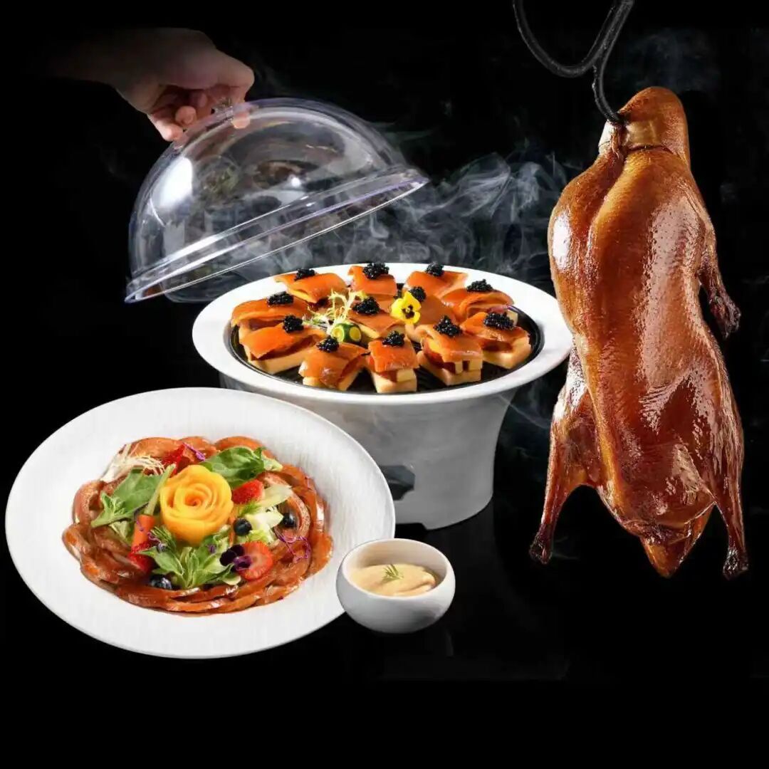 烤鸭三吃打破传统想象。第一吃将片好的鸭子搭配新鲜水果、鹅肝和鱼子酱叠放在一起,每一口都好似味觉探险。鸭肉的丰富香气与水果的清新甜蜜、鹅肝的细腻口感以及鱼子酱的浓郁风味相互交融,带来无与伦比的味觉享受。