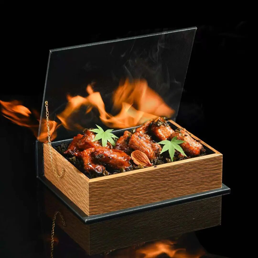 火焰肋排堪称“餐桌魔术”。菜品以魔法书造型外壳登场,服务员在桌前缓缓翻开“书页”,点燃裹着肋排的糯米纸。火光温柔跃动间,糯米纸的清甜与肉香交织弥漫,肋排与点缀的花朵也随之显露,瞬间拉满仪式感。